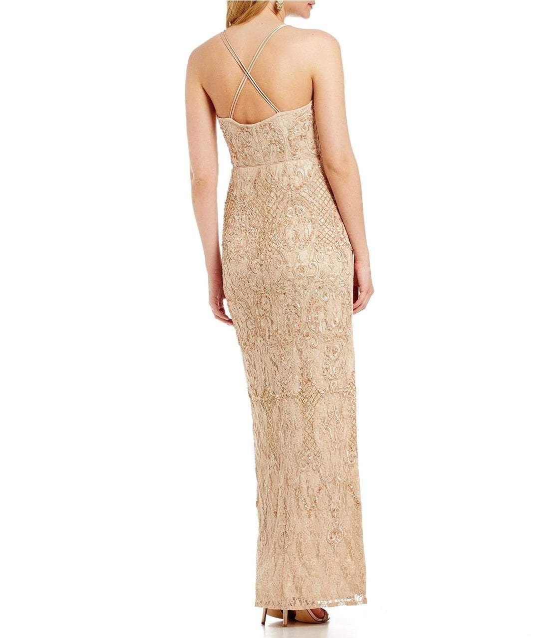 Dazzle all night long as you exude beauty and opulent style in this spectacular Aidan Mattox MD1E200658 creation. Lavishly ornate with a blend of intricate scroll and lattice motifs coupled with stunning embroidery on a lace fabric, this stunning piece shows off a jewel neckline with a cutaway shoulder design. The alluring back displays a crisscrossed design of dual straps on its mid-open back. Shimmering in pure elegance, the sheath skirt parts at the side with a thigh high slit as it completes with a full-length hemline. Inspire the upscale crowd with your iridescent style in this splendid Aidan Mattox masterpiece. Model is wearing the Light Mink color.