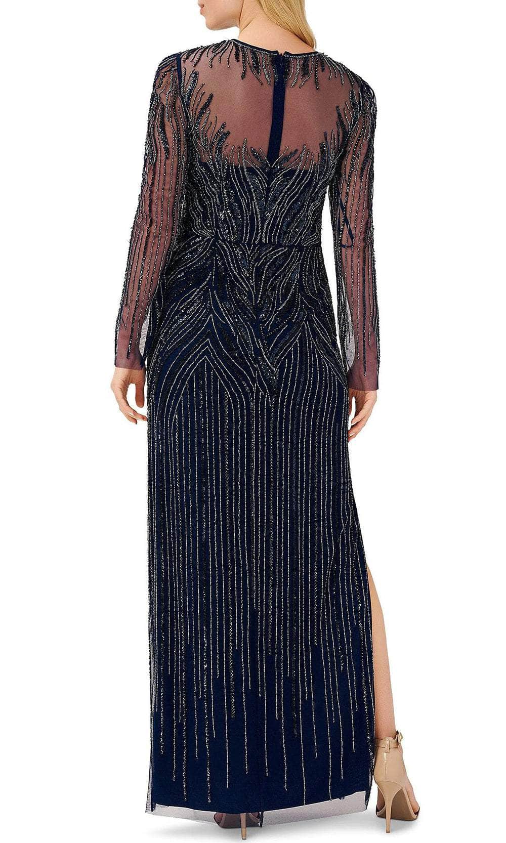 Exude grace when you walk in in this mesmerizingly designed Aidan Mattox MD1E207525 creation. Festooned with intricate tonal beadwork on a sheer mesh silhouette, this gorgeous piece features an illusion jewel with a sweetheart lining. Designed with sheer embellished long sleeves, this beauty also pairs with an illusion back. Parting with side slit, the skirt sculpts from the hips and traverse down into a full length hemline. Have everyone swoon when you pass by in this sophisticatedly designed Aidan Mattox masterpiece. Model is wearing the Navy color.