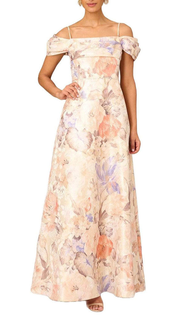 Radiate glamour and sophistication in this Immediate Apparel MD1E207638. Crafted from luxurious Printed Metallic Jacquard, this masterpiece showcases an alluring off-shoulder sleeve and pleated details adorning the straight-across neckline and straps. The back zipper closure ensures a seamless fit, allowing you to move with grace. The floor-length A-line skirt adds a touch of timeless elegance, making it perfect for any special occasion. Captivate attention and make a lasting impression with this Immediate Apparel MD1E207638. Model is wearing Bronze Multi color.