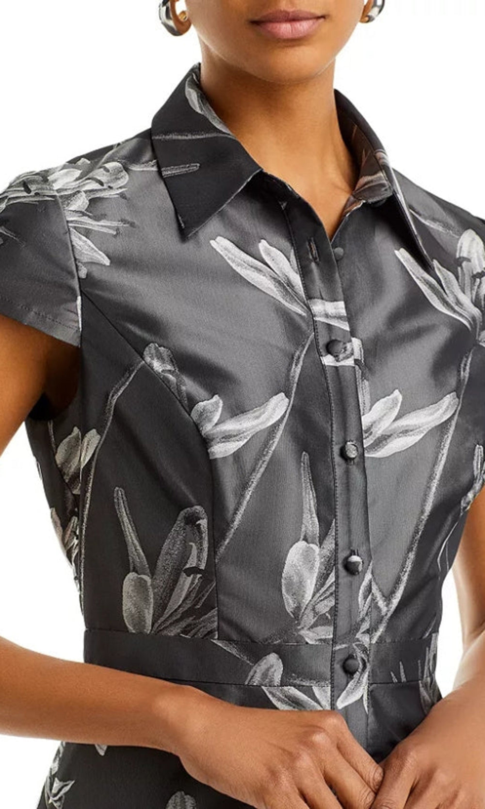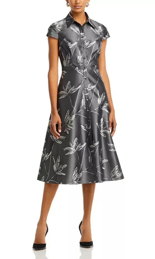 Elevate your collection with Aidan Mattox MD1E208353 for a fashionable statement. Elegance flows naturally in this collared A-line dress where a button front closure and cap sleeves deliver timeless charm. The gentle flare at the skirt moves gracefully, highlighting the natural waist and giving the A-line silhouette a polished appeal. Floral jacquard bring dimension, while the structured collar adds refinement. Aidan Mattox MD1E208353 is ideal for occasions that call for both sophistication and comfort. Model is wearing Grey Multi color.