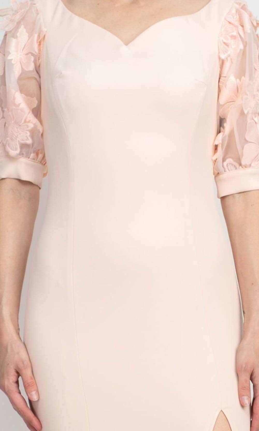 | Details: | Puffed Half Sleeves, Floral Appliques, High Slit, Midrise Back, Zipper Closure, Sweep Train |