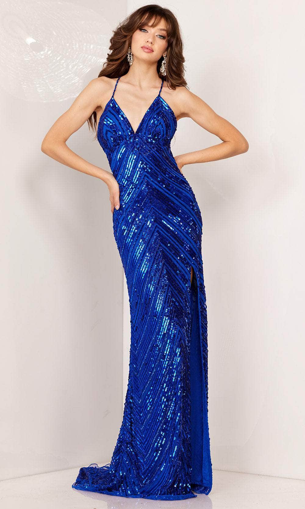 Get ready to make a magnificent entrance in this Aleta Couture 1106 masterpiece. Lavishly festooned with a linear pattern of beadings and sequins, this sleeveless outfit will captivate and illuminate your every step. The deep v-neckline is alluring, while the adjustable spaghetti straps guarantee a flawless and comfortable fit. It also boasts a daring thigh-high leg slit and crisscross backless style, revealing a glimpse of skin. The skirt drapes your frame in a flattering sheath silhouette, finished off with a sweeping train. You are statuesque in a posed gown from Aleta Couture 1106. Models are wearing the Australian Black, Ivory Iridescent, Lilac Iridescent, and Royal colors.