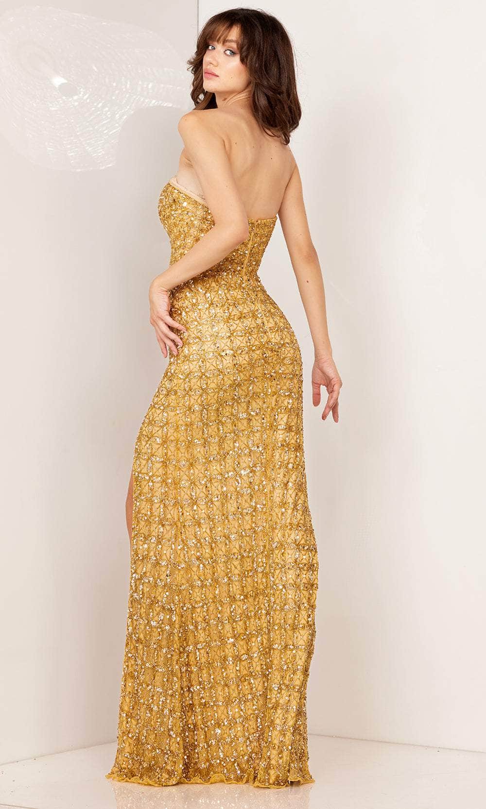 | Details: | Strapless, Fully beaded, Plunging neckline, Nude sheer inset, Form fitting, High side slit, Mid-open back, Lined, Back zipper closure |