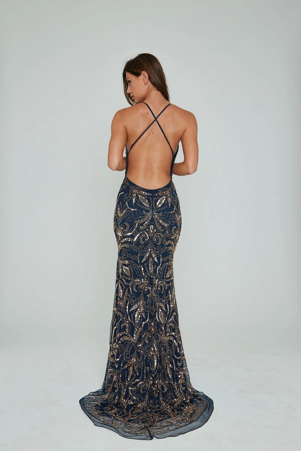 | Details: | Fitted, Sleeveless, Sequin Embellished, Spaghetti Straps, Full Length, Crisscross Open Back, Sweep Train |