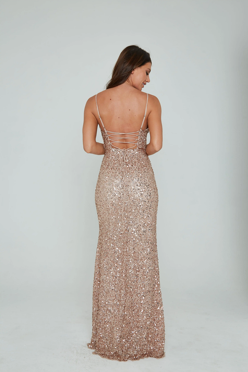 Details: Fitted, Sleeveless, Sequin, Thin Straps, Full Length, High Slit, Open Back, Lace Up
