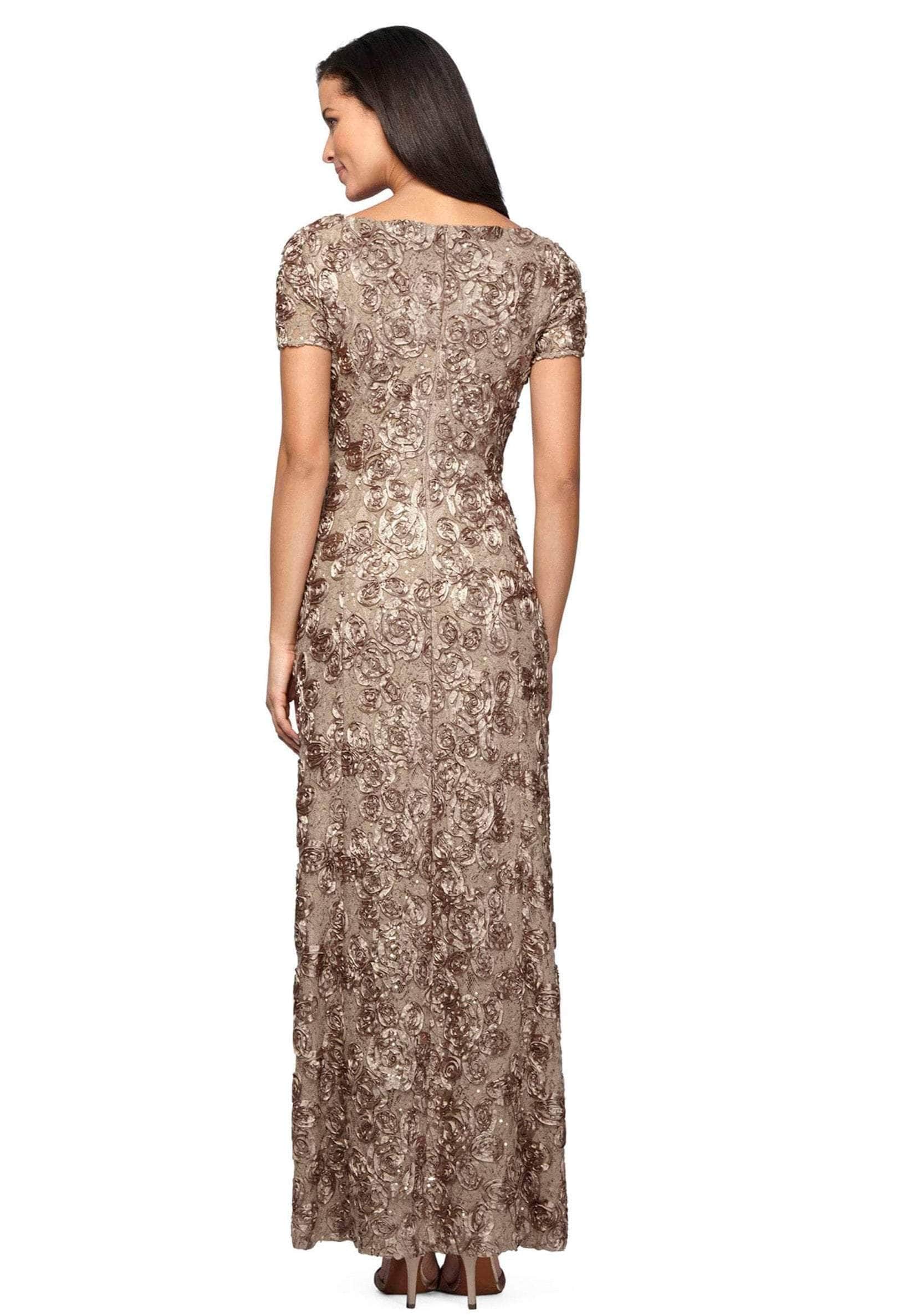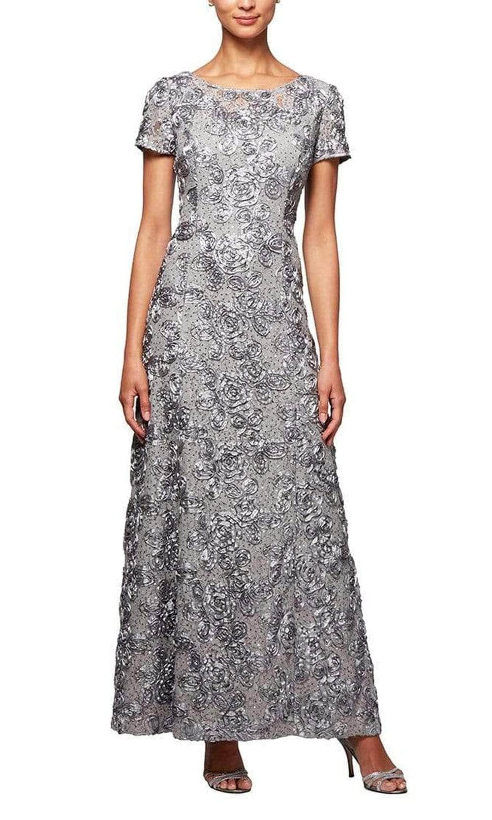 Radiate timeless beauty in the Alex Evenings 112788, a sophisticated choice for any special occasion. This enchanting Rosette gown showcases a semi-sheer scoop neckline with delicate short sleeves, framing a princess-seamed fitted bodice for a flattering silhouette. The raised back, secured with a center zipper, ensures a polished finish. Lavishly adorned with floral soutache detailing, the gown flows into a slim A-line skirt that gently sweeps the floor. Whether celebrating a Mother of the Bride moment or another cherished event, this exquisite Alex Evenings design guarantees an unforgettable presence.