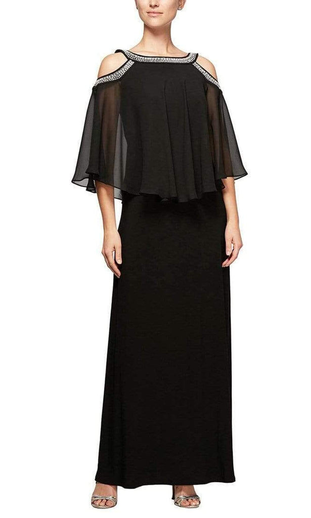 Crown the ballroom with your presence in this Alex Evenings 1351319 creation. Styled with a sheer chiffon capelet, this dress reveals beaded trims accenting the scoop neckline with a cold shoulder detail. The full back has a zipper closure. The sheath silhouette contours into a full length hemline. Shine like a celebrity when you debut this Alex Evenings masterpiece.