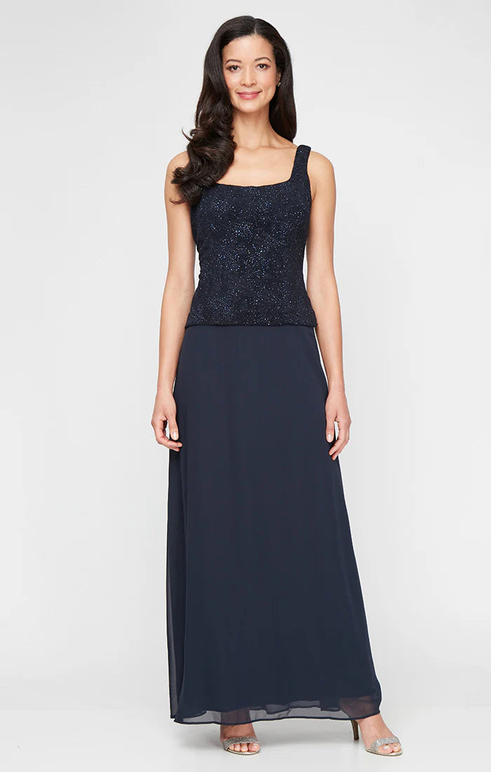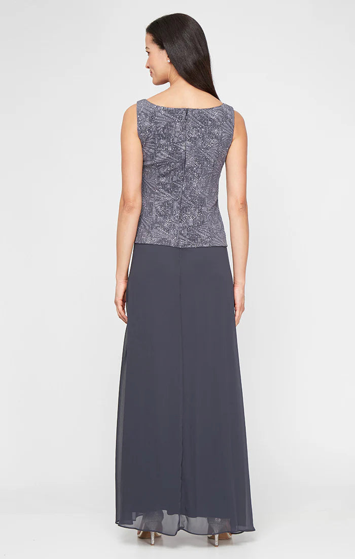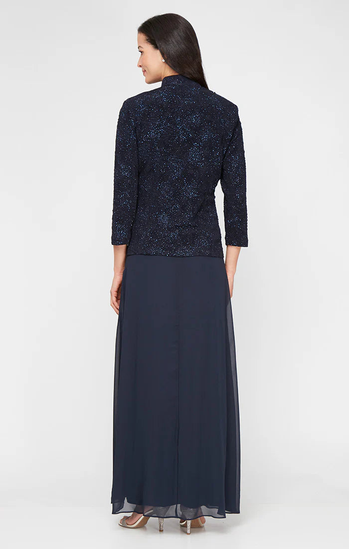 Be beautiful in this fashionable evening dress by Alex Evenings 225053. Two-piece dress with square neckline and no sleeves, as well as an optional quarter-sleeve jacquard jacket with sparkling adornment, and shows off a buttoned Mandarin style neckline are featured in this collection. The elegant chiffon skirt is fully lined and made in a sheath silhouette that is finished in a full-length hem. This Alex Evenings style is a classic look that works for many special occasions.
