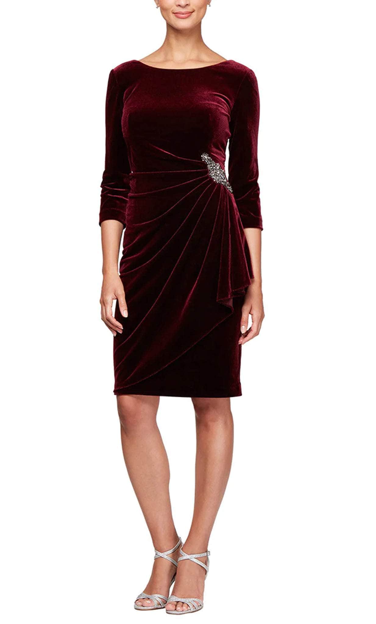 Surround yourself with decadence in a dazzling dress from Alex Evenings 2915268. This dress's knee-length hem is a comfortable length and draws attention to your curves. Detailed with a side drape and ruching, as well as quarter-length sleeves, a fitted bodice, and a shirred skirt. This velvet masterpiece features an appliqué embellished with jewels. Radiate a fresh style as you orchestrate a dramatic entrance in this radiant Alex Evenings 2915268. Models are wearing Forest and Wine colors.