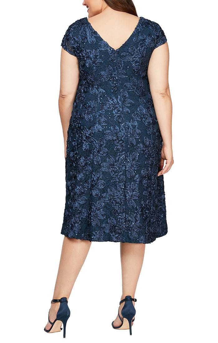 Be strikingly gorgeous wearing this Alex Evenings 4121570 knee-length dress. This features a cap sleeve, bateau neckline with fitted bodice styled with lustrous rosette appliques and sequin detail for added glamour and texture. The skirt reveals an A-Line silhouette while the back highlights a V-shaped cut and zipper closure to complete the look. This Alex Evenings creation is simply breathtaking!