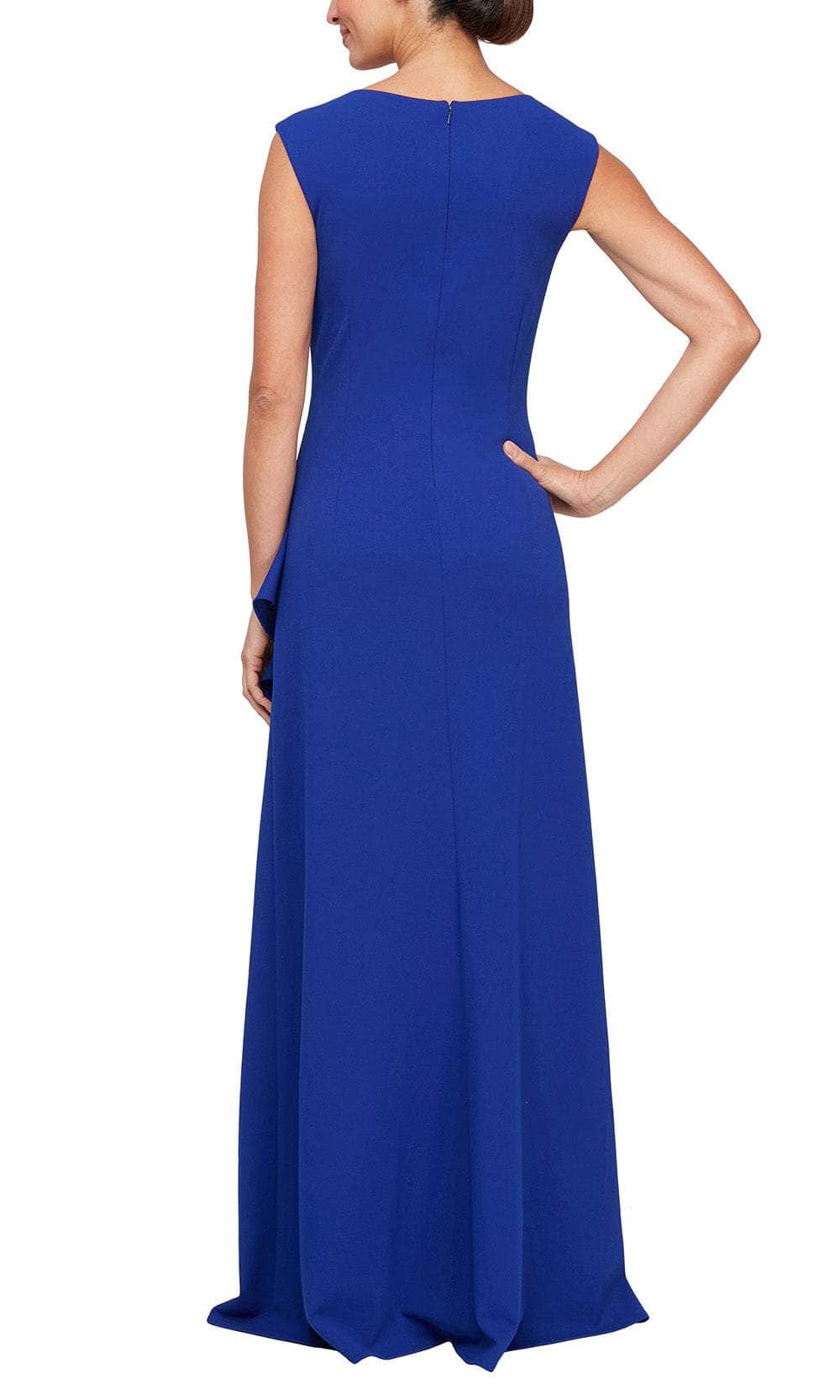 Get ready to draw attention when you wear this Alex Evenings 5160414 creation. Simple yet gorgeous, the dress exhibits a square neckline perfectly complemented by the cap sleeves. In addition, it has soft ruched details on the bodice, and a full back design with zipper closure for a comfy fit. The sheath skirt hugs your curves perfectly, elevated by a high leg slit and cascading ruffle detail that adds a touch of drama. This design by Alex Evenings 5160414 is all set to make your evening extra special! Model is wearing Royal color.