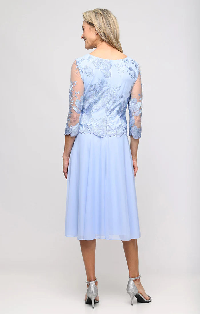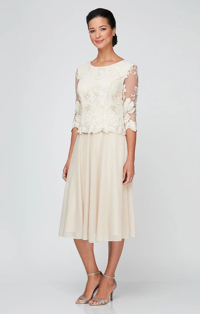Take their breath away with this stunning Alex Evenings 81122420 creation. This dress features a jewel neckline and illusion quarter sleeves in lovely accents of floral embroidered lace with scalloped edging that creates a classic look. The soft chiffon skirt flows down to a pleated tea-length hem while the back highlights a V-shaped cut and center zipper closure. This Alex Evenings style is simply captivating!
