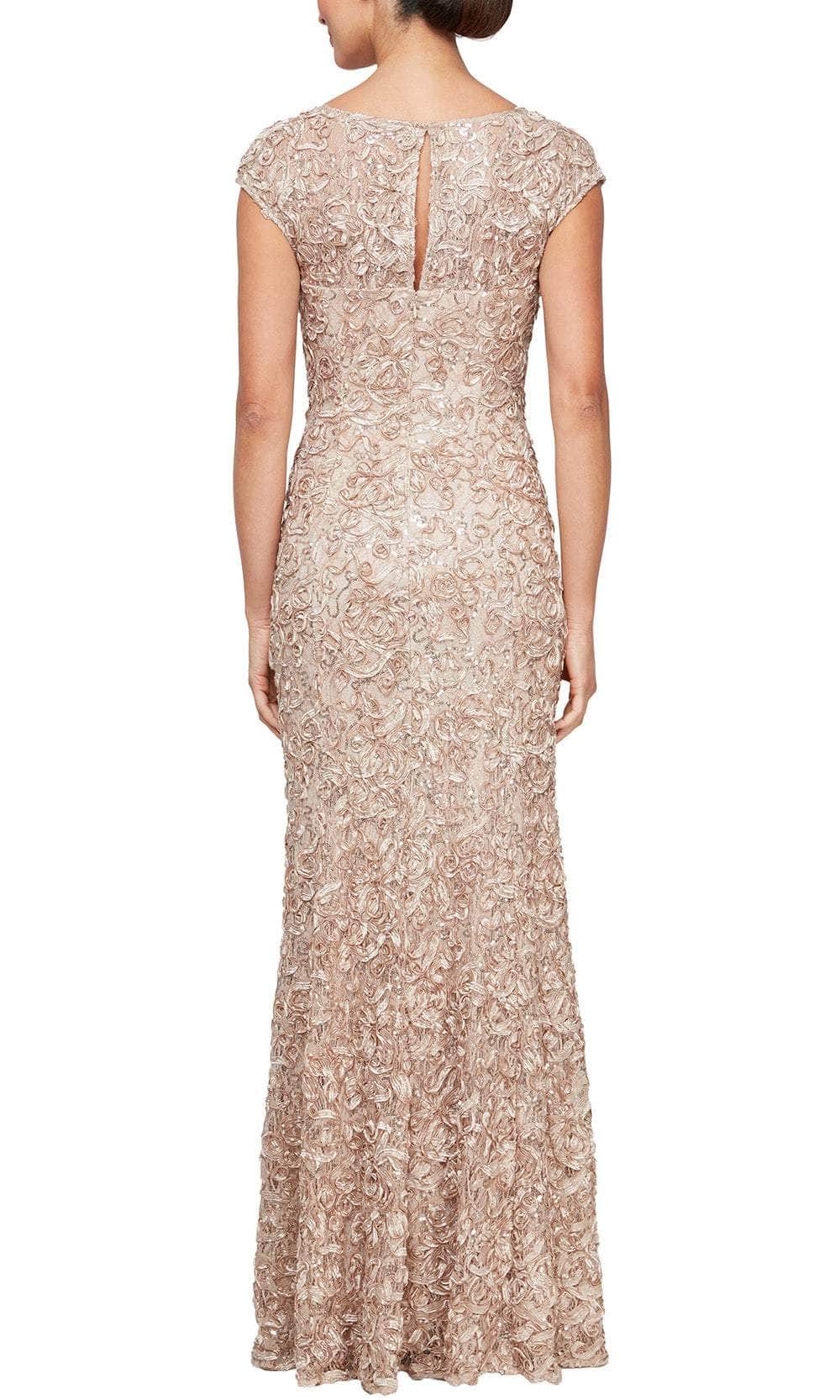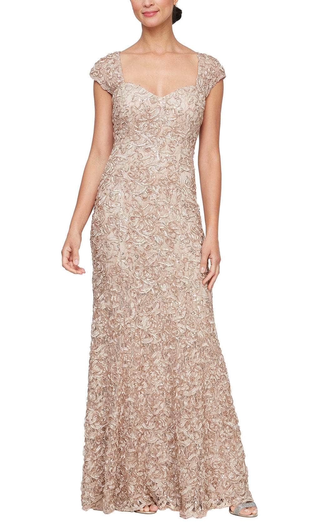 Elevate your formal ensemble to the next heights in this Alex Evenings 81122588 masterpiece. Crafted from soutache lace fabric, this dress embraces femininity and allure. It offers a sweetheart neckline and cap sleeves, as well as a closed back with a sultry keyhole design. A concealed zipper closure at the back provides easy wear. The skirt is tailored in a beautiful sheath silhouette that traces your curves and ends in a full length hemline. Complete with a matching shawl that adds elegance. Flatter your finest assets as you enthrall the crowd in this Alex Evenings 81122588 dress. Model is wearing Champagne color.