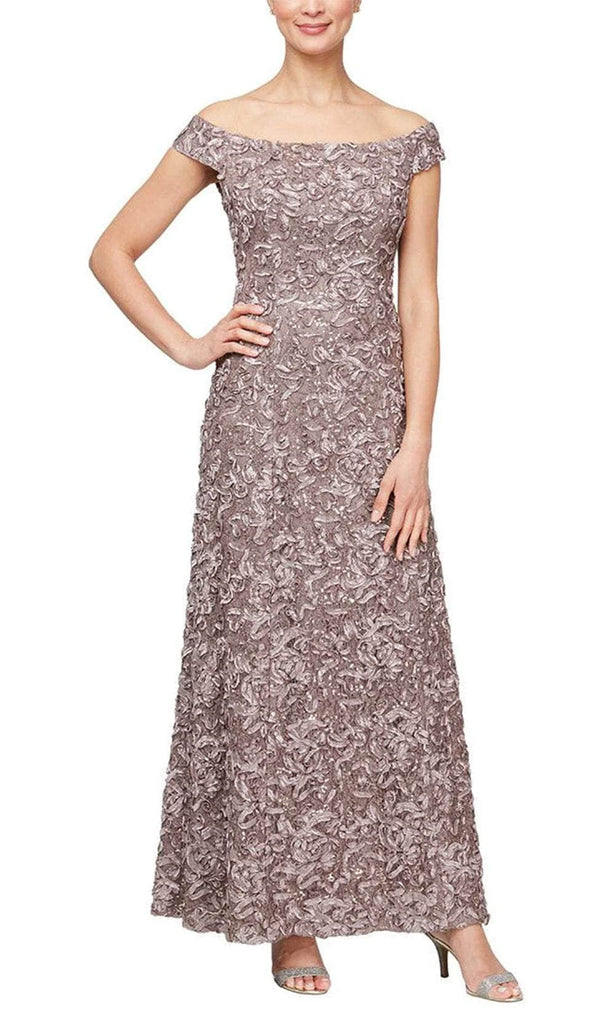 Shine all night long with the elegance of this Alex Evenings 81122612 evening dress, a stunning ensemble designed to turn heads. Crafted from exquisite soutache detailed fabric with meticulous tailoring lines, this gown exudes timeless elegance. The cap sleeves and off-shoulder neckline create a graceful silhouette, while sequin detailing adds a touch of shimmer and allure throughout its length. The mid-open back adds a hint of allure, complemented by a concealed zipper closure for a seamless finish. The fit-and-flare skirt boasts a trumpet silhouette, gracefully cascading to a full-length hem, ensuring a captivating entrance at any formal event. Elevate your evening ensemble with the unmatched sophistication of Alex Evenings 81122612. Model is wearing the Mink color.