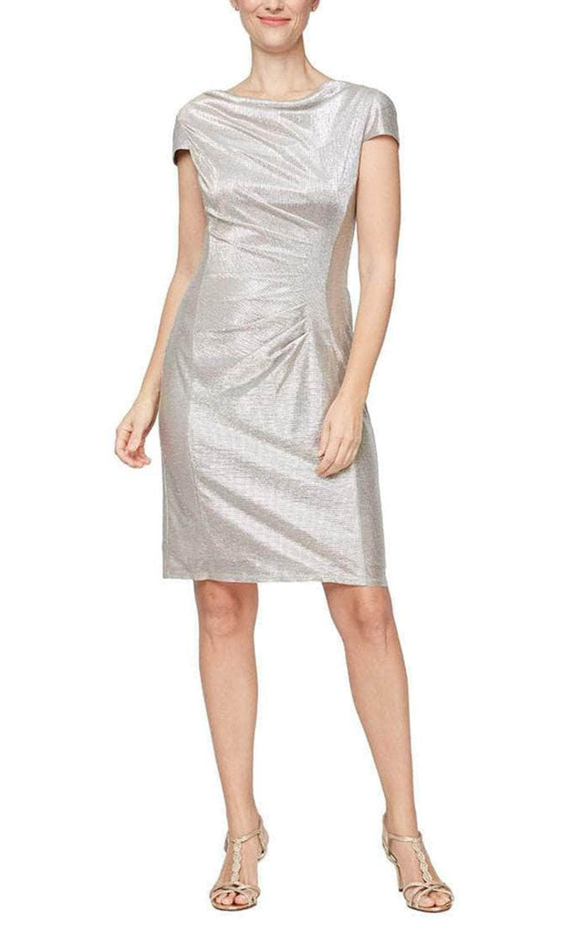 Capture the essence of fashion-forward luxury with the Alex Evenings 8127686 dress. Boasting a sleek and attractive silhouette, this cap sleeve sheath dress boasts a tasteful bateau neckline coupled with a cowl back detail that's sure to make you the center of attention. Crafted from top-tier materials, this short special occasion dress will become a favorite piece in your wardrobe. Indulge in a timeless piece that exudes sophistication and elegance. Model is wearing the Champagne color.