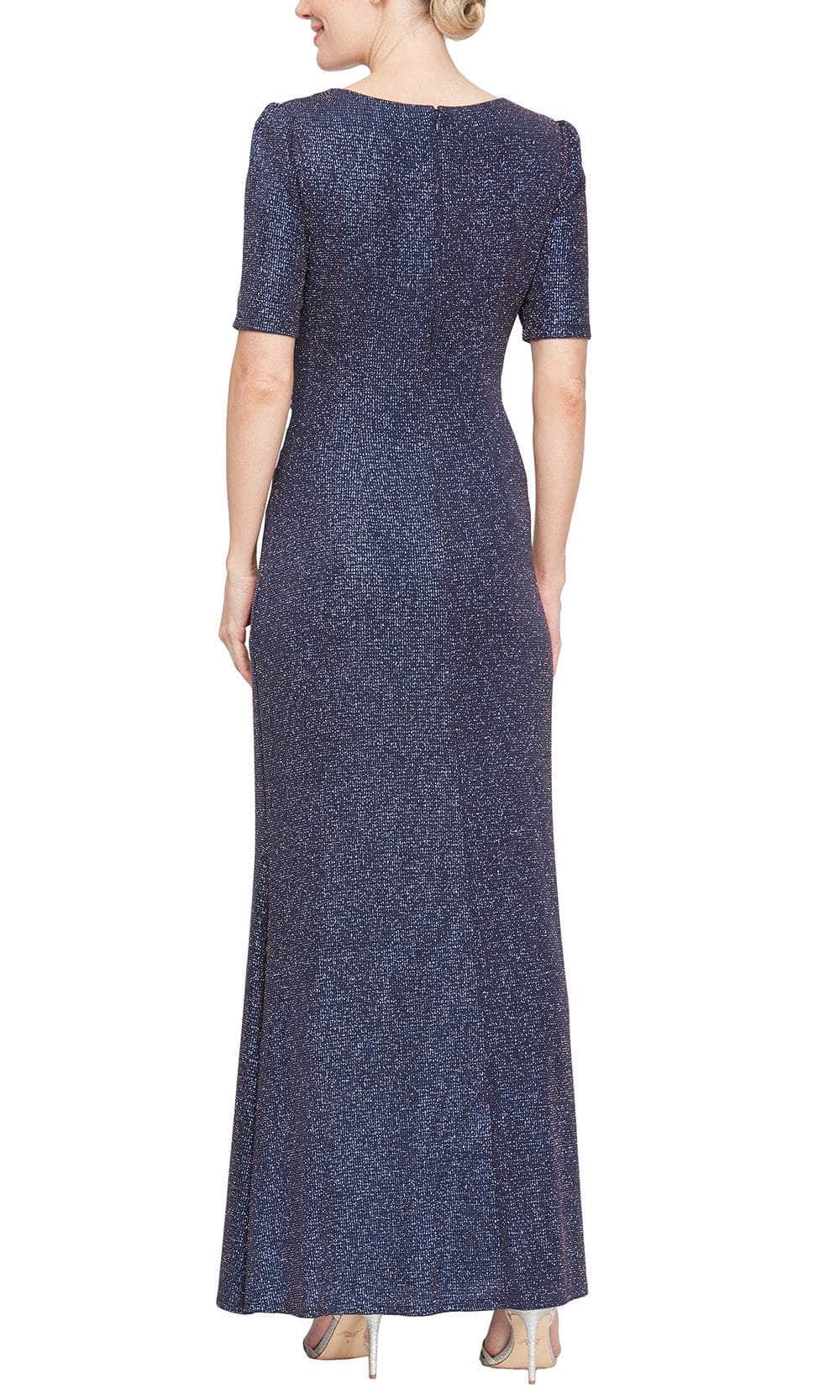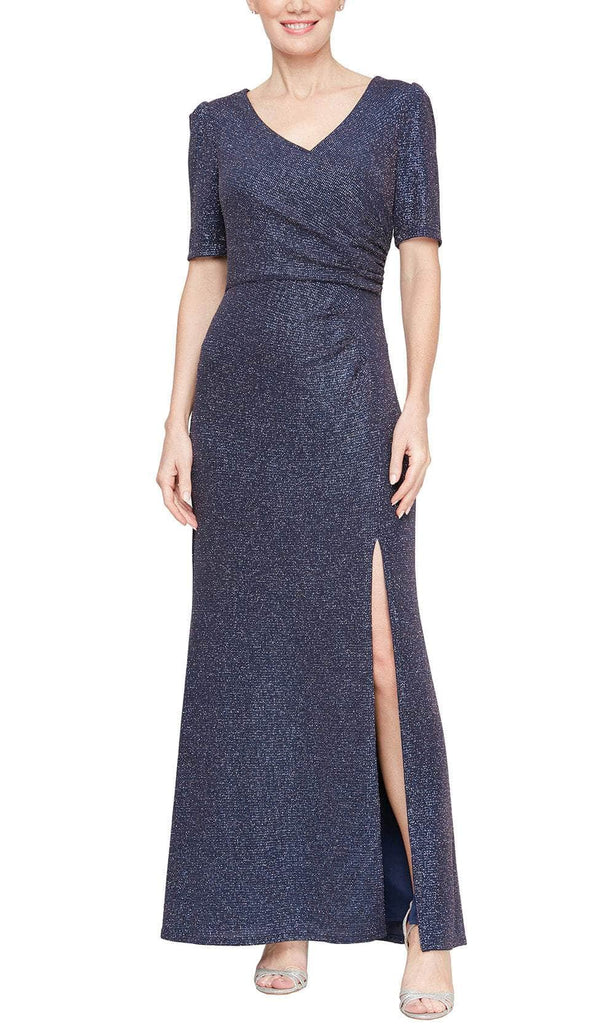 Own the night in this dazzling creation from Alex Evenings 8127851. This outfit is crafted from metallic knit that attractively shimmers under the lights. It boasts a surplice v-neckline that exudes timeless appeal, while the back is fully covered and has concealed zipper closure. Short sleeves provide comfort and style for the arm. Parting a sultry side slit, the skirt finishes in a sheath silhouette that charmingly falls to the full-length hemline. This Alex Evenings 8127851 long gown is sure to leave a lasting impression. Model is wearing Navy/Gold color.