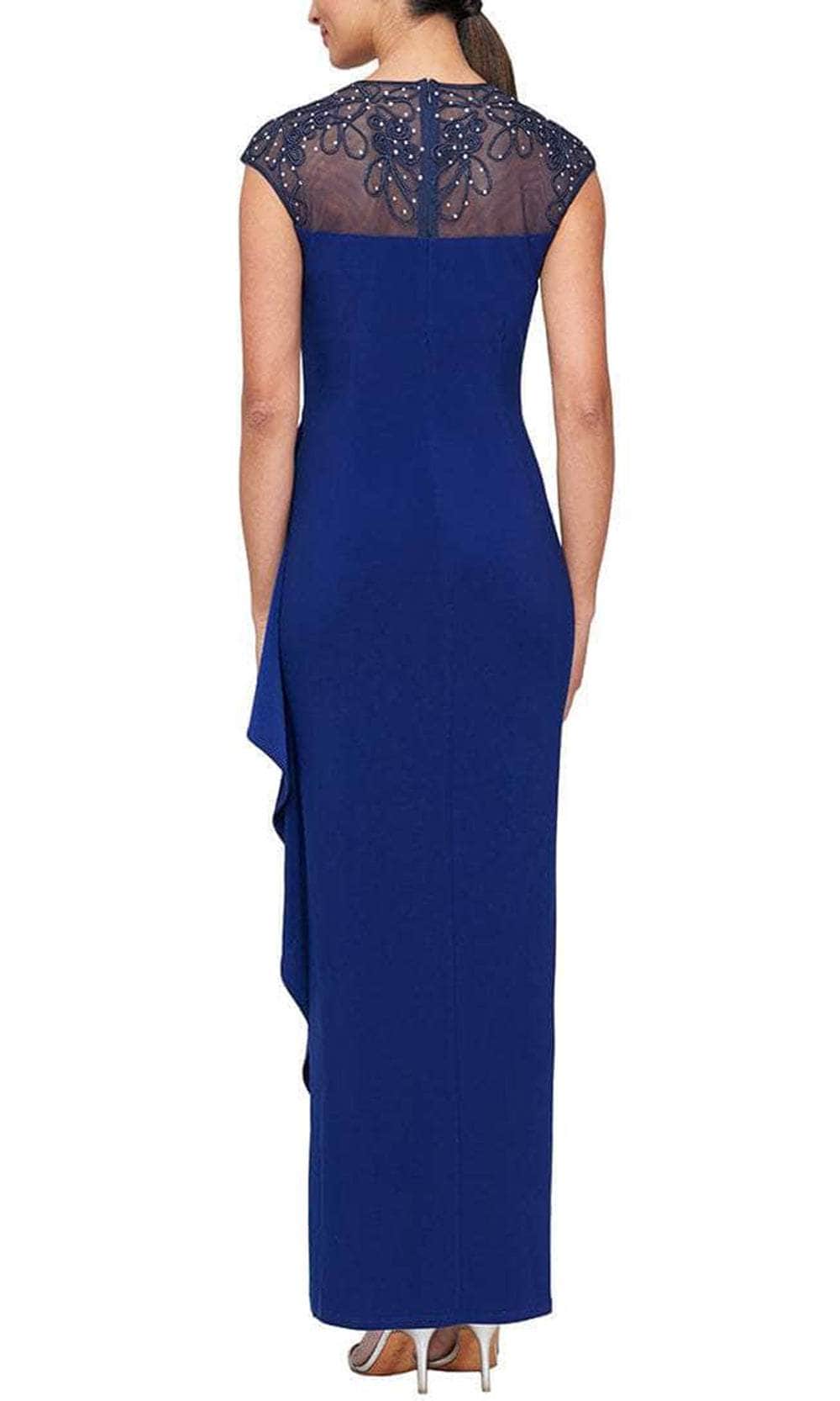 Lavish in the exquisite elegance of this exemplary dress by Alex Evenings 81351585. This figure-flattering gown is made from our soft matte jersey fabric and features a gorgeous embellished illusion detail at the neckline and back of the gown. Created with a seam-sculpted bodice for an incredibly figure-flattering fit, this stunning gown features an empire waistline and a full back. Soft ruching gathered at the side of the hips creating a faux wrap style in A-line silhouette. Make everyone swoon when you arrive in this simple yet chic Alex Evenings dress. Model is wearing royal color.