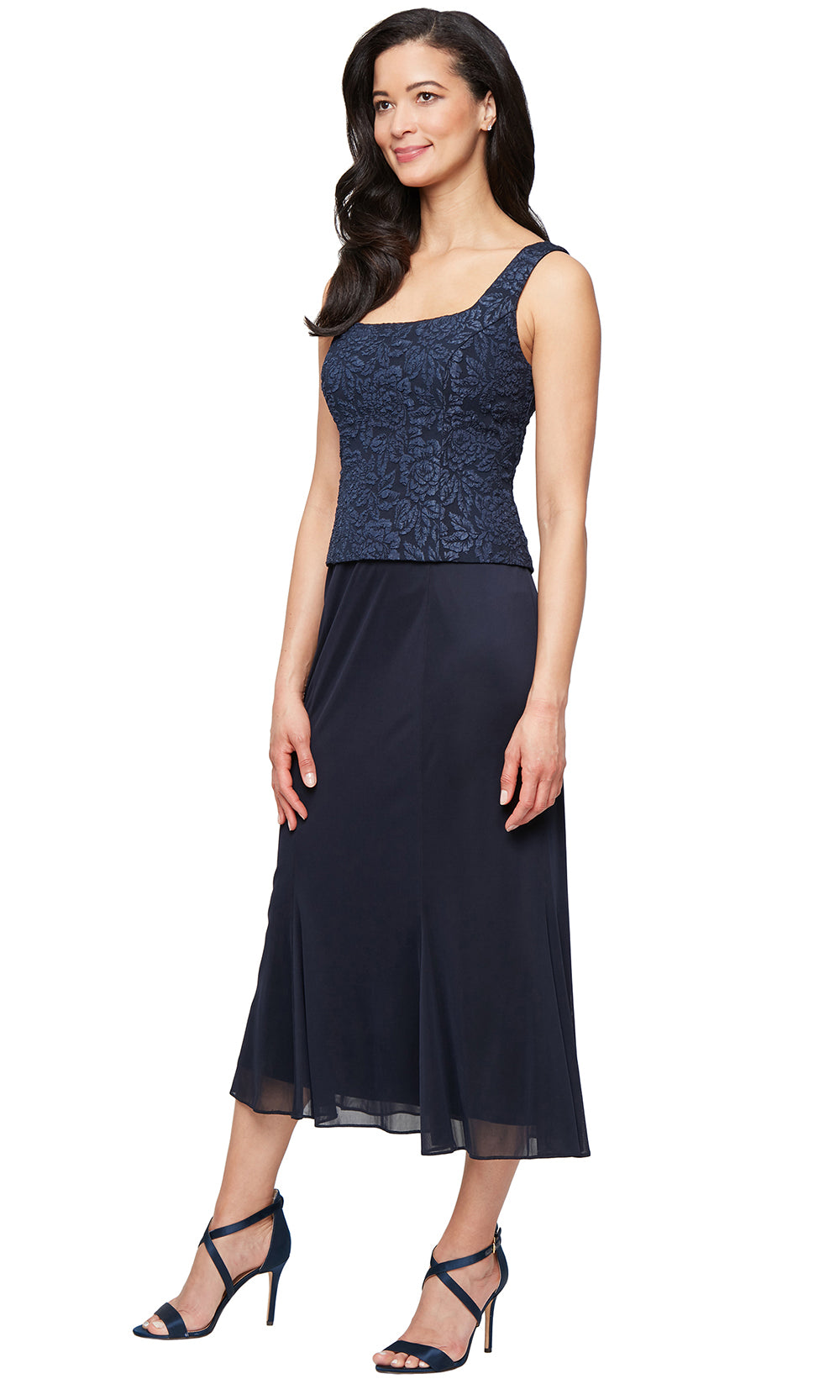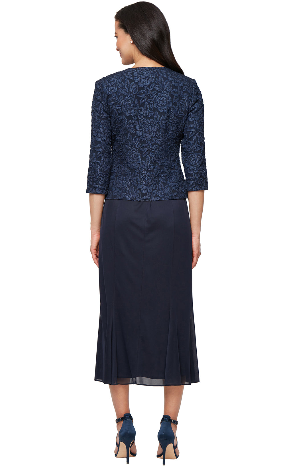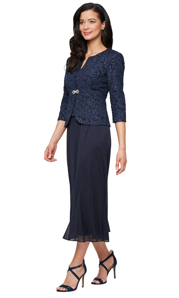 This Alex Evenings 8157038 tea-length dress delivers a polished layered look, perfect for daytime weddings or semi-formal gatherings. The three-quarter sleeve jacket overlays the scoop neckline bodice and fastens with a decorative hook at the center. From the natural waist, the skirt flows in a soft sheath shape, providing comfort and flattering movement. The textured jacquard adds visual depth while keeping the design refined. The Alex Evenings 8157038 offers a versatile style that transitions seamlessly from ceremonies to receptions. Model is wearing Navy color.
