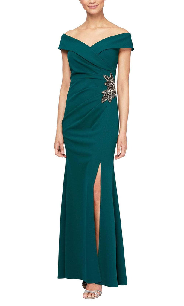 Flaunt your sophisticated style in this exquisite Alex Evenings 8160198 Off-Shoulder Surplice Dress. Rich beading across the hips adds a luxurious touch while ruching and a front slit elevate your evening look. Perfect for a special occasion or as a mother of the bride, you'll be sure to make an unforgettable entrance. Crafted with quality and elegance in mind, this dress will highlight your best features and make you feel confident and beautiful. Model is wearing the Emerald Green color.