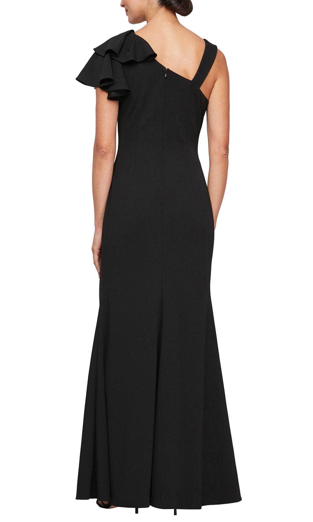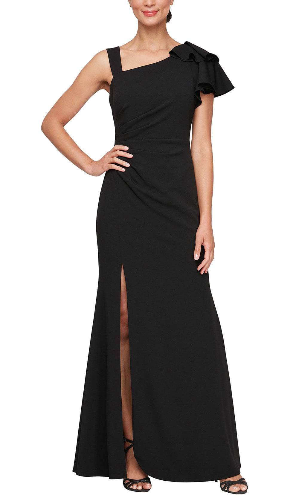Create unforgettable memories in this Alex Evenings 8160422 creation. This simply stunning gown showcases a ruched detail gathered on the side waist, adding style and elevating your shape. The single short flutter sleeve is feature, while the wide strap on the other side offers extra support. The mid-open cut in the back adds an element of surprise, while being fastened by hidden zipper closure. A high side slit ensures effortless movement. Complete with a sheath skirt that elegantly flows to the full-length hemline. This Alex Evenings 8160422 piece is an essential addition to your wardrobe! Models are wearing Black, and Wine colors.