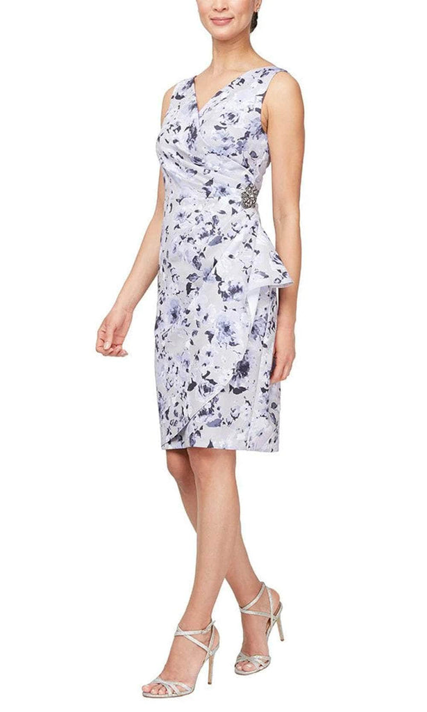 Introducing elegance in motion with the Alex Evenings 8160433 short dress, where floral crepe fabric meets impeccable tailoring for a refined silhouette that's sure to turn heads. Embrace sophistication with its sleeveless design and a mesmerizing v-neckline gracefully draped over a wrap-style bodice, exuding timeless charm. A delicate brooch adorns one side of the waist, adding a touch of sparkle to the ensemble. Revel in the allure of its v-open back, secured with a concealed zipper closure for a seamless finish. The draped surplice skirt flows effortlessly, complementing the sheath silhouette and culminating in a chic short hem. Make a statement in style with Alex Evenings 8160433. Model is wearing the Silver Multi color.