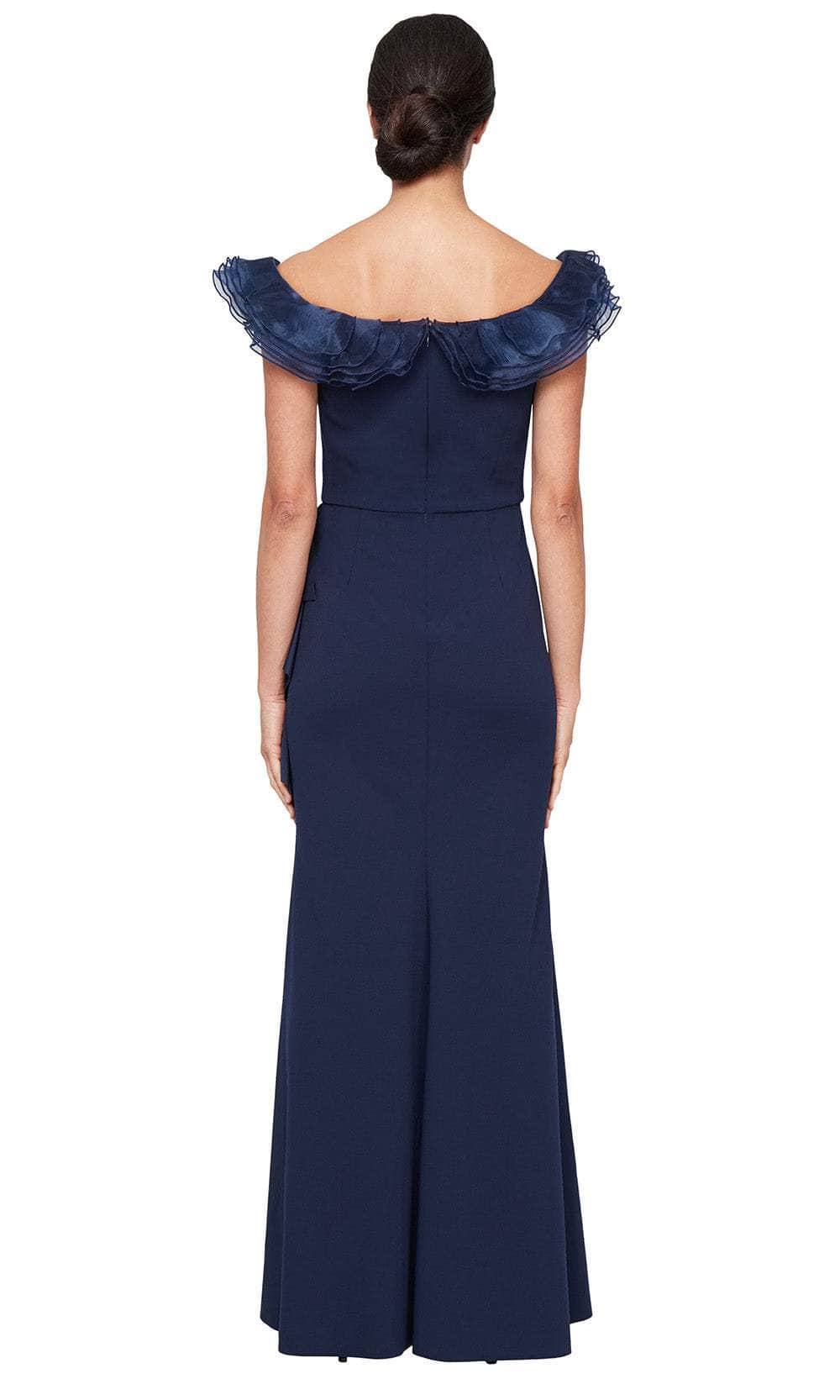 Step into timeless glamour with the breathtaking beauty of the Alex Evenings 8160476 gown. The off-the-shoulder neckline and mid-open back is decorated with organza ruffle detailing, bringing an element of drama to the structured silhouette. A ruched waist accentuates the figure, flowing seamlessly into a mermaid skirt that exudes sophistication. The side draped overlay and tulip hem adds a graceful touch, elevating the overall design. Crafted from stretch crepe, this gown offers a smooth and comfortable fit. Perfect for making an impression, this Alex Evenings 8160476 creation is a must-have for special occasions. Model is wearing Navy color.