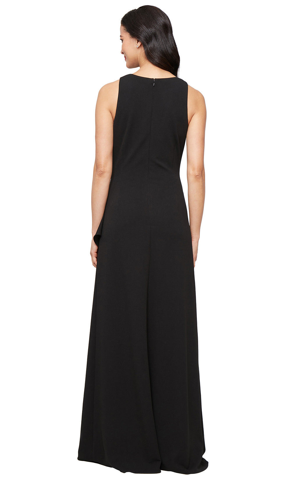 A sleek and modern design defines this Alex Evenings 8160479 long gown, delivering a silhouette that feels both poised and contemporary. The sleeveless jewel neckline offers a refined frame for the shoulders, leading the eye to a side waist detail adorned with shimmering beadwork. Below, a cascade ruffle falls along the slit, adding movement and interest to the sheath skirt. Balanced proportions and clean lines make this Alex Evenings 8160479 style a standout for formal occasions. Model is wearing Black color.