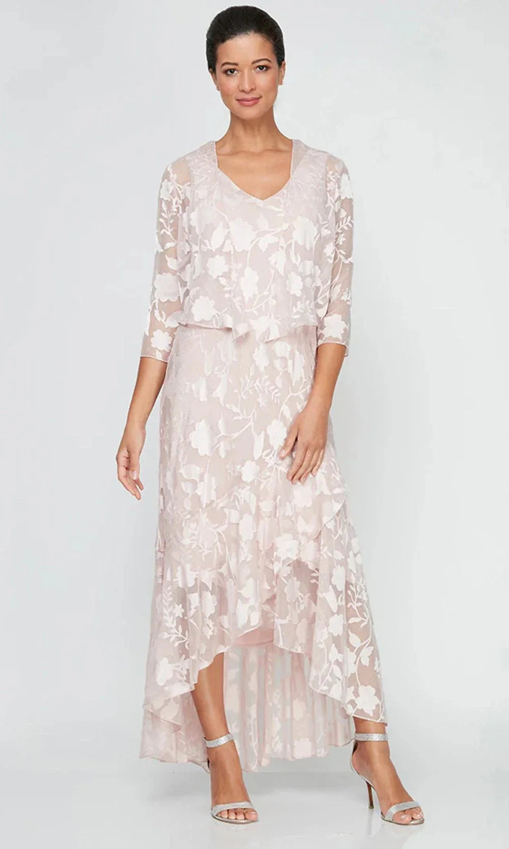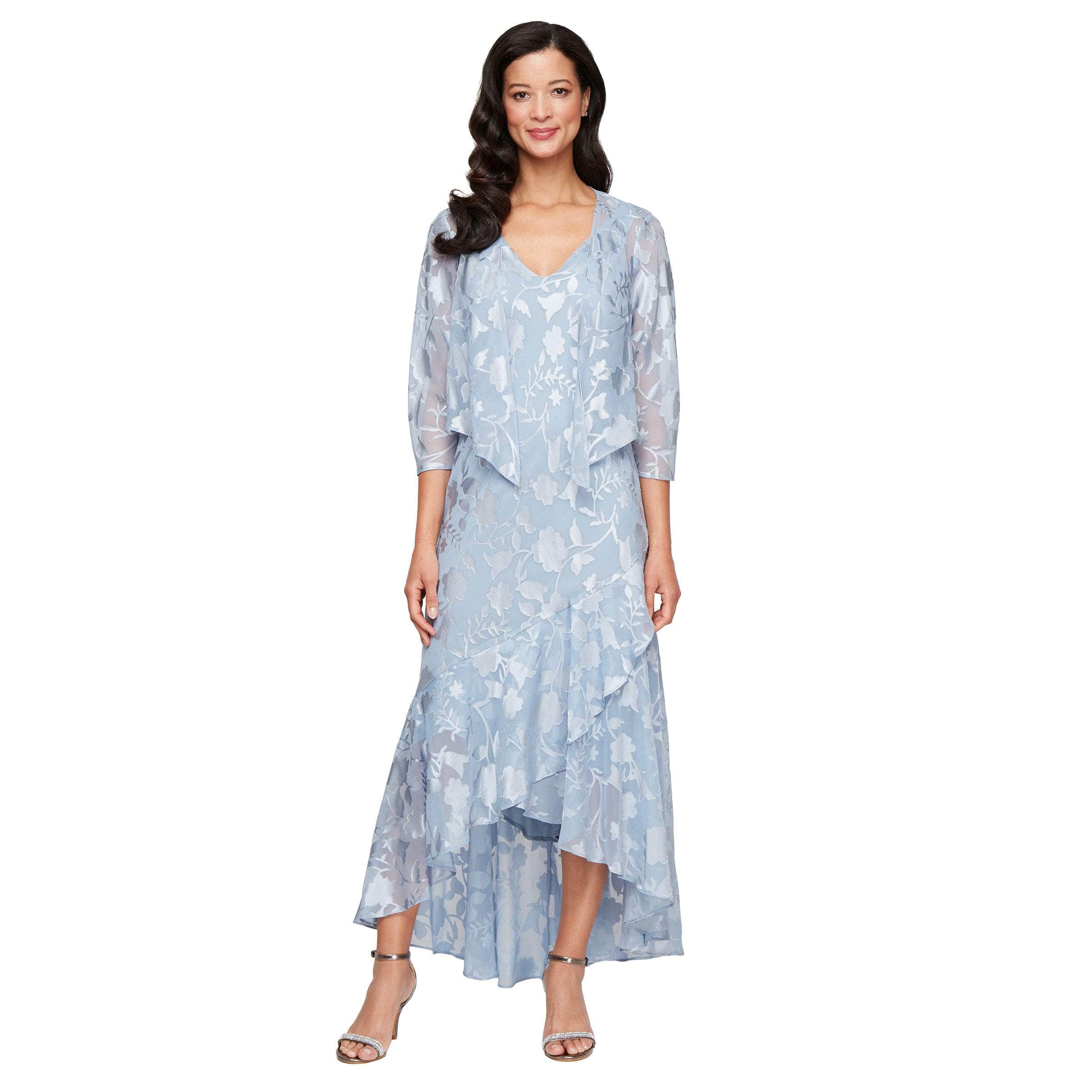Graceful and versatile, the Alex Evenings 8175804 ensemble blends style and comfort for any semi-formal or formal gathering. Crafted from airy chiffon with a charming floral print, the sleeveless dress flows into a tulip-style high-low hem that moves gracefully as you walk. Paired with a matching cascade jacket featuring quarter sleeves, this look is perfect for weddings, receptions, or elegant brunches. Experience effortless sophistication in this timeless two-piece set.> Style: alev_8175804 Fabric: 63% Polyester, 37% Rayon Details: Sleeveless, Ruffle Tulip Hem, Quarter-Length Sleeves Jacket, Floral Print, V-Shaped Back Length: High Low Neckline: V-Neck Waistline: Natural Silhouette: Sheath