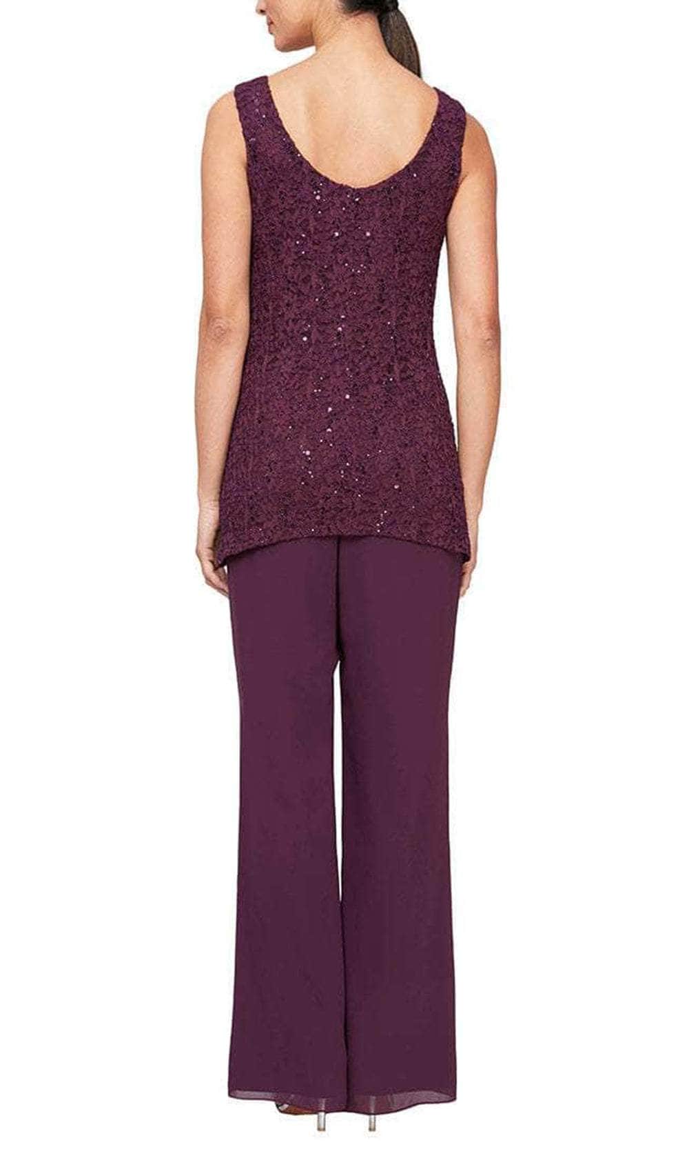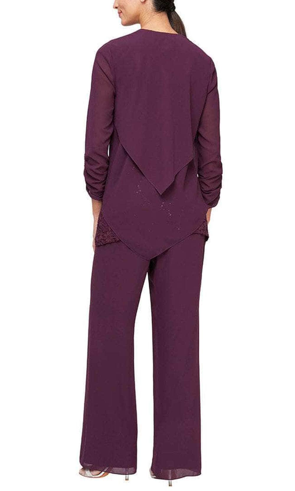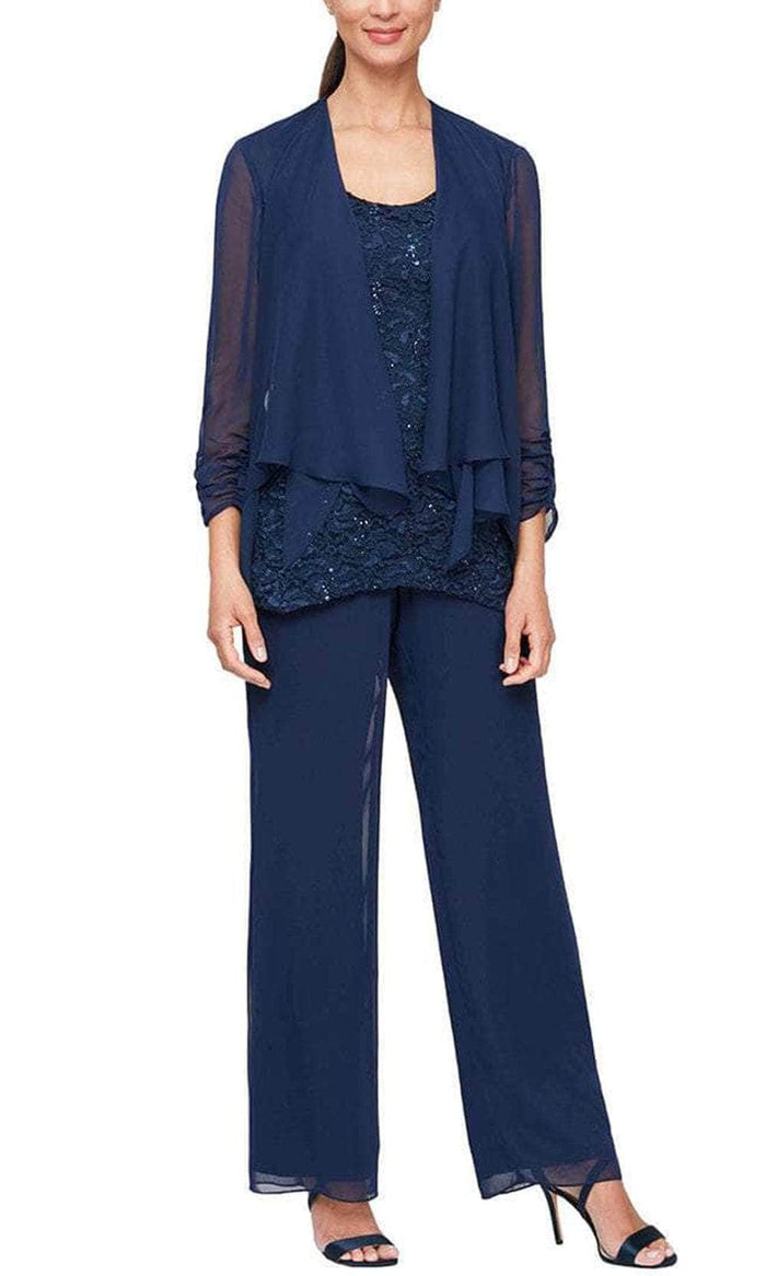 Be effortlessly beautiful when you show up in this Alex Evenings 8192002 creation. Accentuated by a sleeveless scoop neck inner adorned with intricate beadwork, paired with a long-sleeved jacket, tank and pant set will be your go-to outfit for many occasions. The relaxed silhouette sits away from the body, skimming curves and the lightweight chiffon lined pants are comfortable and breezy. Perfect to pack for vacation, cruise, or destination wedding. Claim that look of sophistication wearing this classy Alex Evenings masterpiece. Models are wearing Navy, Raisin, and Wedgewood colors.