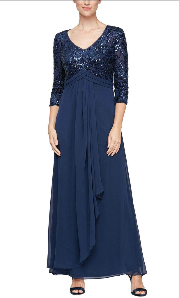 Wrap yourself with a style that is incredibly unforgettable in this Alex Evenings 8196784 creation. Festooned with a myriad of blossoms in sequins, this stunner shows a v-neckline with embellished quarter sleeves. Rendered with pleats that come together to craft an inverted basque waist, the chiffon skirt flaunts soft folds as it cascades into an A-line silhouette with a full length hem. Grace the party with pure flair in this beautiful Alex Evenings masterpiece. Models are wearing the Navy and Mink colors.