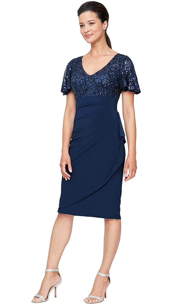 This magnificent Alex Evenings 8196786 creation will make your event more special. The fabulous bodice of this elegant formal dress is embellished with sequins that will captivate the attention of the crowd. It has short sleeves and is crowned with a V-neckline. The sheath skirt is cinched in the empire waistline with cascading details and a ruched style at the back. This masterpiece by Alex Evenings 819678 is undeniably captivating! Model is wearing Navy colors.