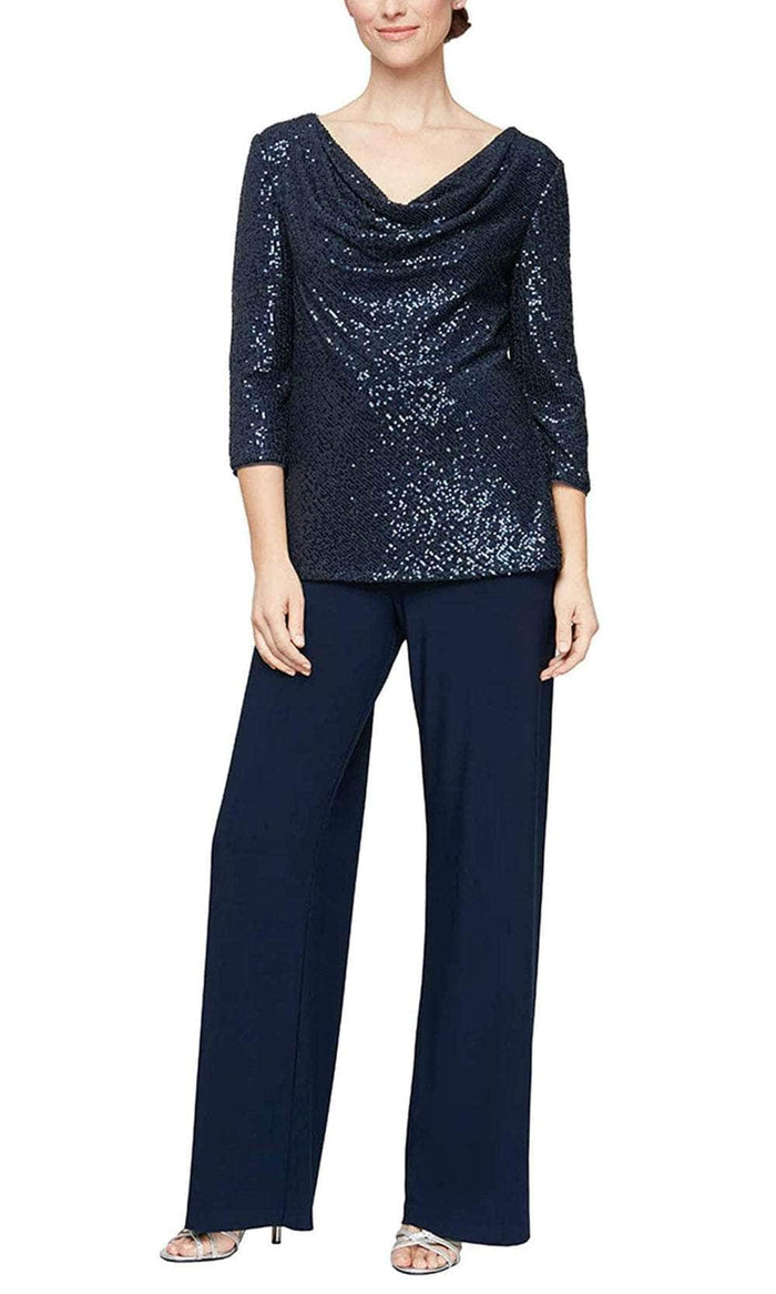 Look sophisticated and mature in this simple yet chic Alex Evenings 8196808. The bodice of this two-piece pantsuit is embellished with glittering sequins that will let the wearer shine glamorously. It is crowned with a cowl neckline and framed with quarter sleeves. The gorgeous pants are not-so-fitted and it is in full length. This Alex Evenings 8196808 style is a sure standout on your next evening social event. Models are wearing Dark Navy and Plum colors.
