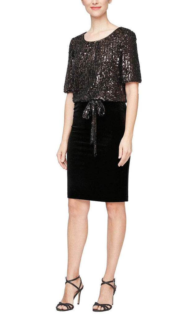 For a special occasion look that exudes sophistication, look no further than Alex Evenings 8196915. This elegant ensemble features an intricately sequin-embellished blouson top with string waist and short sleeves. The fitted skirt sits above the knee and is designed in a solid toned fabric. Create an air of exclusivity for any occasion with this chic and tasteful ensemble. Let Alex Evenings make your day truly unforgettable with timeless, luxury fashion that will last for years to come. Model is wearing the Blk/Bronze color.