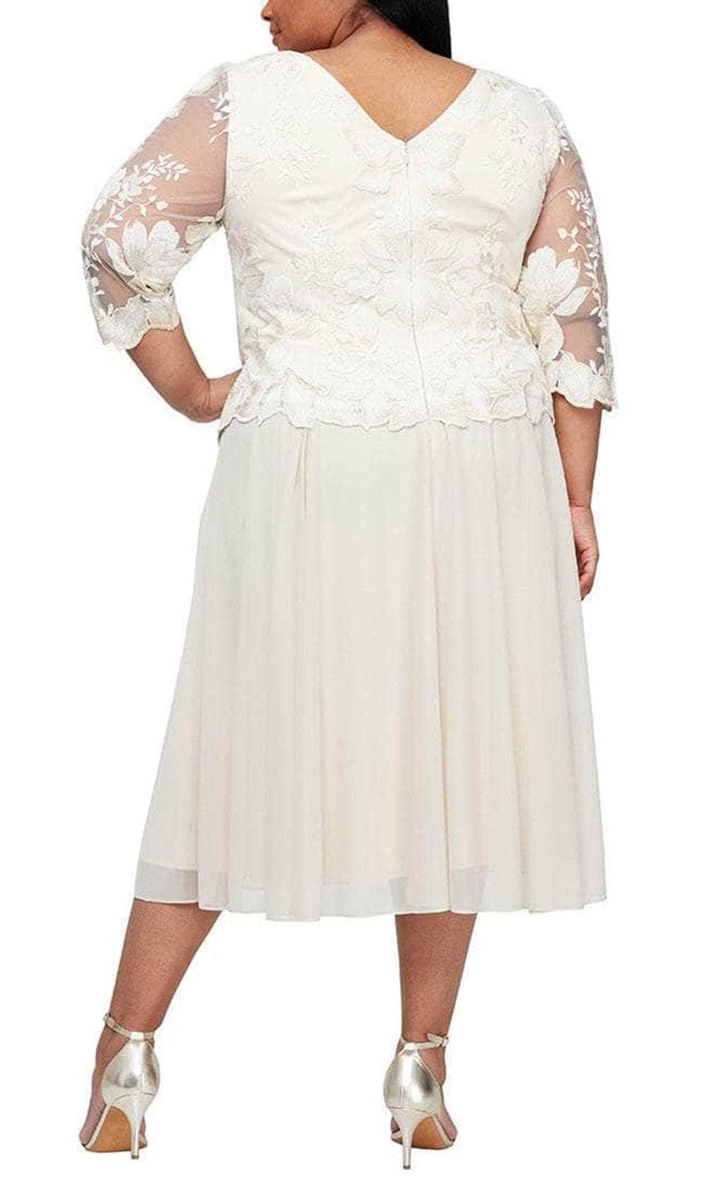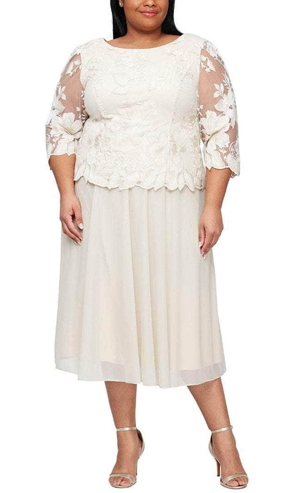 Walk-in a defined sophistication and beauty wearing Alex Evenings 82122420. This gorgeous dress that is tailored in a chiffon fabric has a fashionable style as it is accentuated with floral embroidery from the bodice to the 3/4 sleeves that make it perfectly elegant. This masterpiece is supported with a back zipper closure, then completing the look is an A-line silhouette skirt that gives more sophistication to its look. This elegant dress By Alex Evening would make a luxurious mother of the bride or groom dress, wedding guest dress, or black tie evening gown. Model is wearing Ice Sage color.