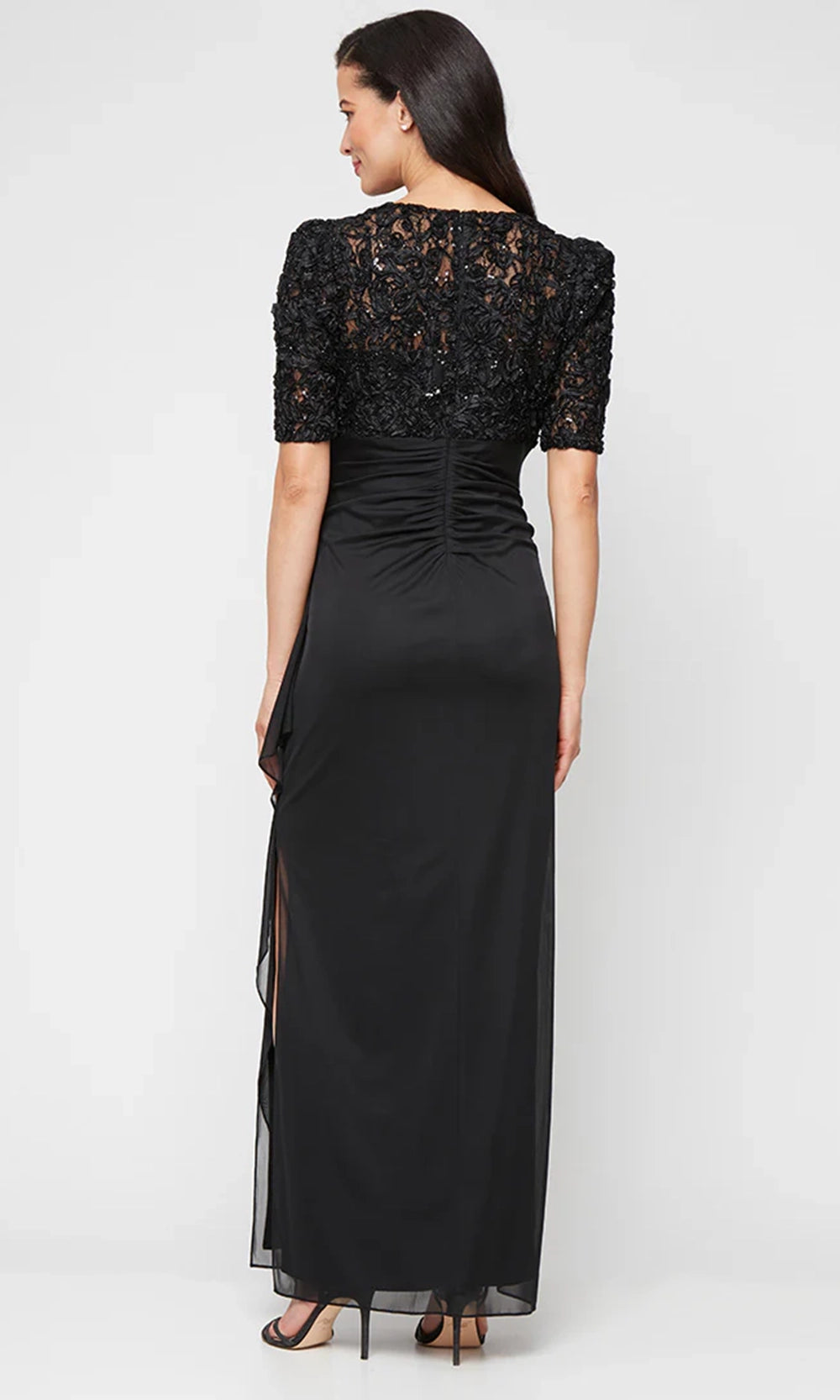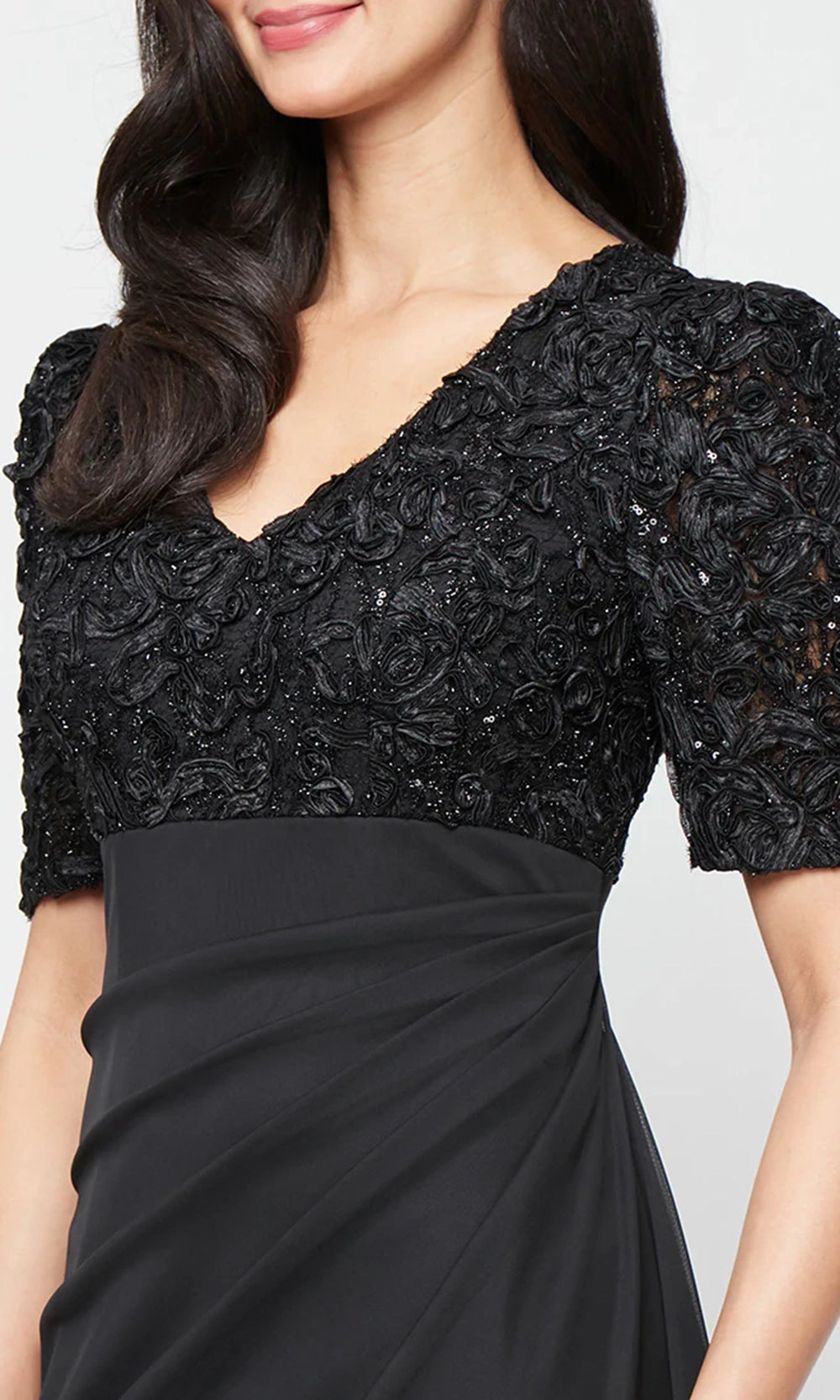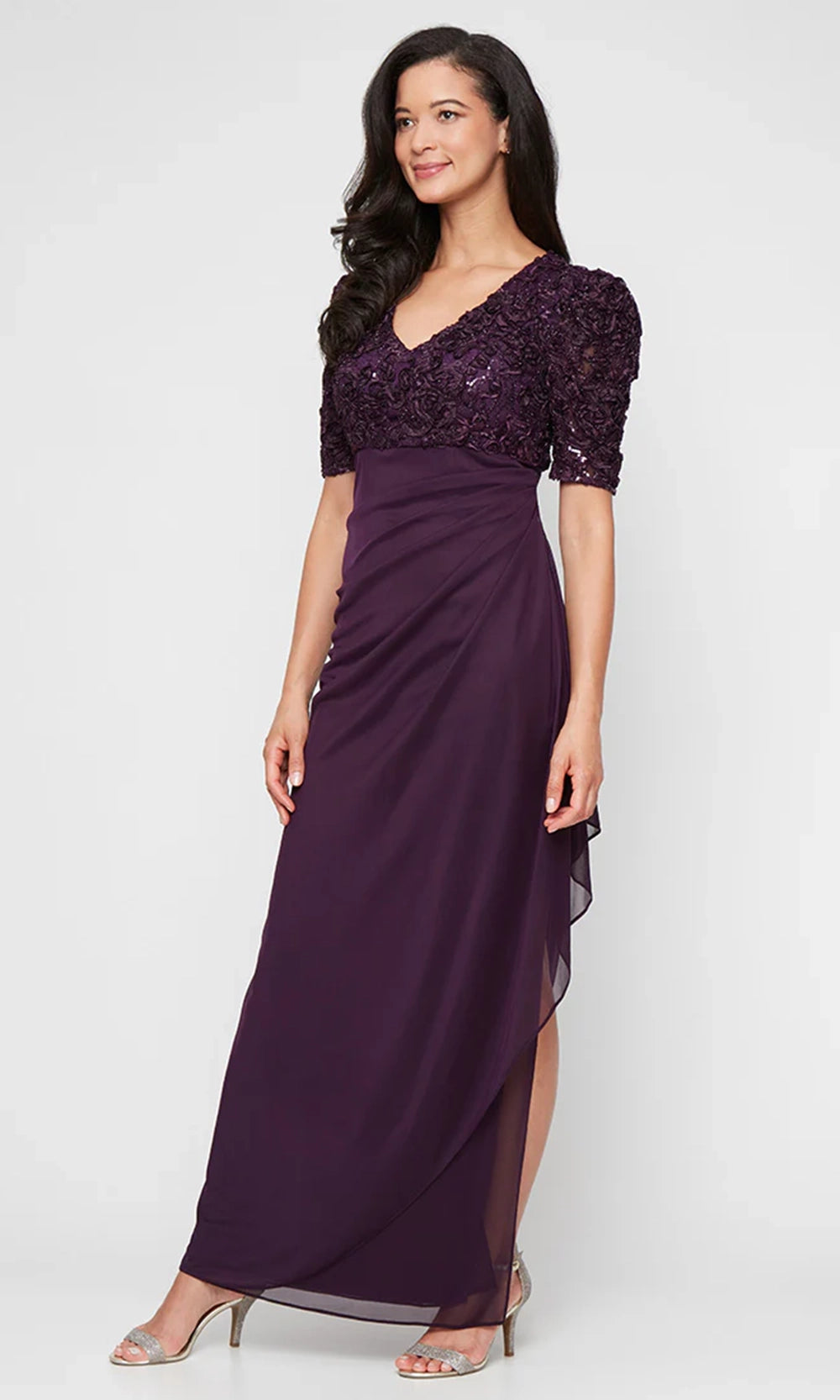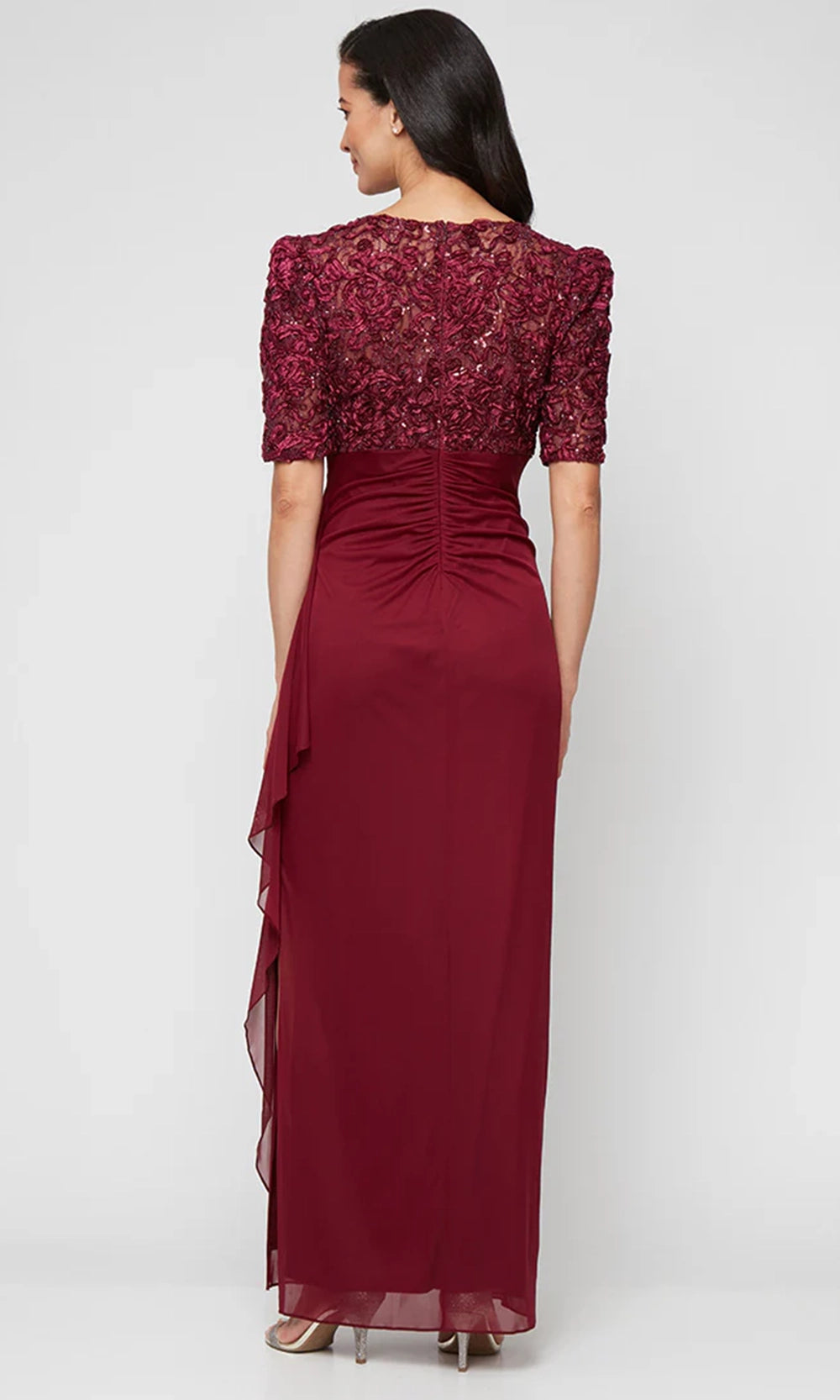 An expression of graceful charm, this Alex Evenings 82122633 long column gown enhances formal wear with intricate texture and flowing silhouette. A richly detailed soutache bodice creates striking dimension while short puff sleeves softly frame the shoulders, imparting romantic allure. From the empire waist, a dramatic cascade ruffle skirt drapes fluidly, moving beautifully with every step. The design is completed with v-neckline and side leg slit. Ideal for weddings, galas, or special receptions, the Alex Evenings 82122633 delivers a timeless look that delights both eye and presence. Models are wearing Black, Deep Plum, and Wine colors.