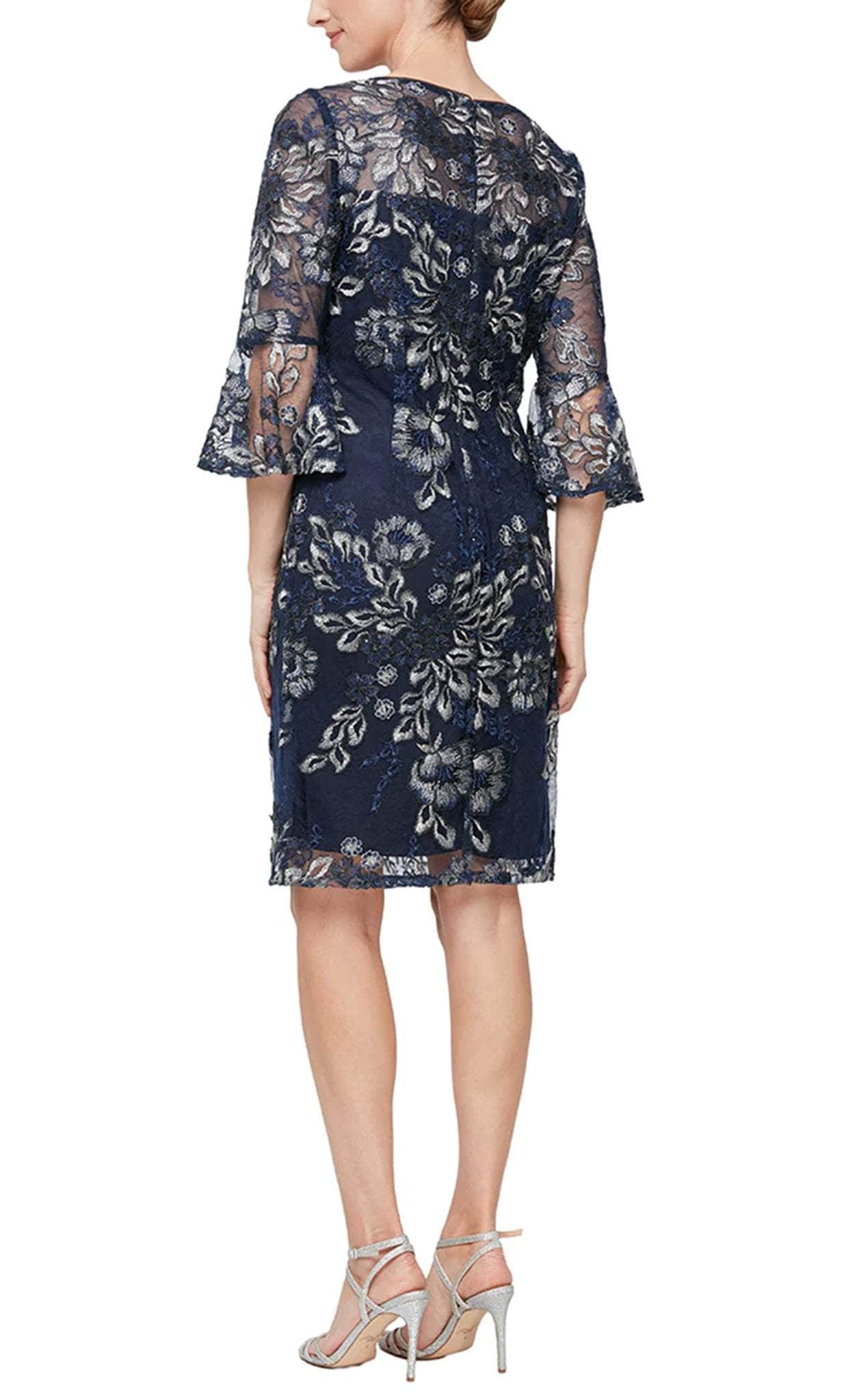 Take center stage at night in this magnificent Alex Evenings 82171384. Be the woman they are dreaming of as you wear this magnificent dress that is beautifully embroidered with floral applique. This has an illusion neckline with quarter-bell sleeves. The full-back is secured with a zipper closure. The skirt has a sheath silhouette that flows down to a knee-length hemline. Step into the spotlight in this stunning Alex Evenings 82171035 masterpiece. Model is wearing Navy Silver color.