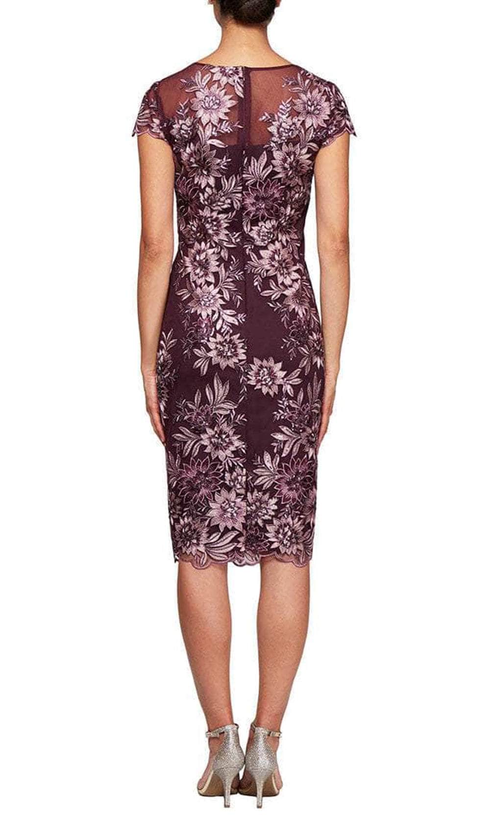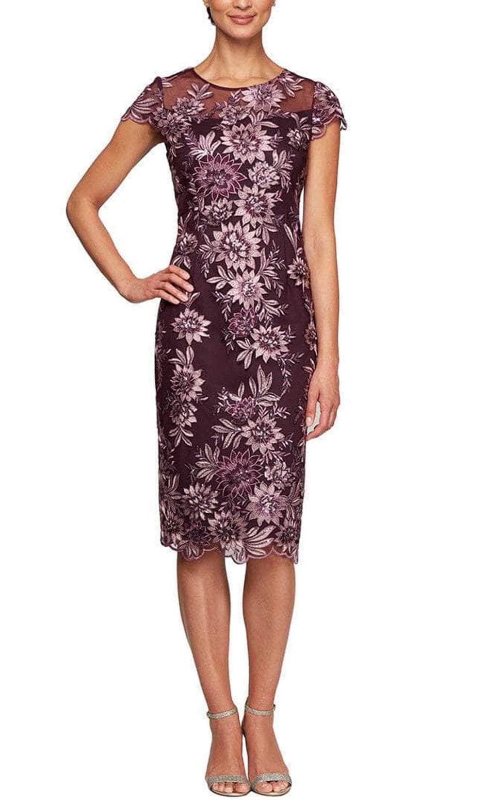 Show off your classy style when you wear this Alex Evenings 8217953. A perfect dress for that special occasion because you will be noticed because you are wearing a classic dress that exudes elegance and sophistication. The floral embroidery is a one-of-a-kind design that will make you stand out in a crowd. This lovely masterpiece features an illusion jewel neckline, cap sleeves, and a sheath silhouette. This stunning gown is supported by a back zipper closure. Get noticed in Alex evenings' radiant masterpiece. Model is wearing Plum Color.