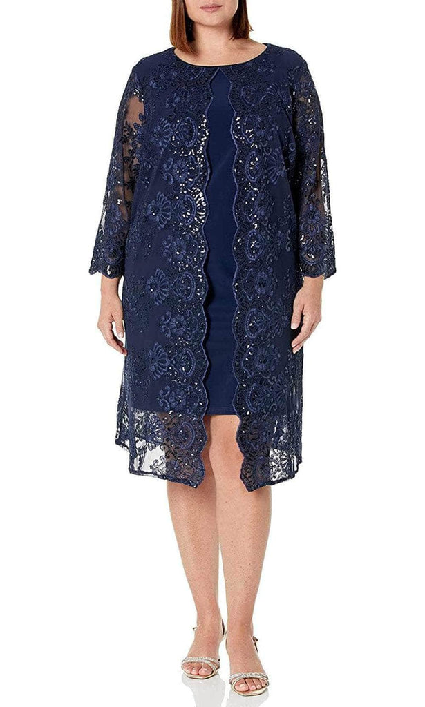 Go beyond expectations at your upscale event in this elegantly designed Alex Evenings 841712226 creation. Detailed with a spectacle of intricate embroidered details and sprinkled with iridescent sequins, the long sleeve jacket displays a sheer silhouette with gorgeous scallop details. The sheath dress shows off a scoop neckline as it sculpts into an above the knee length hem. Tantalize everyone by the iridescent beauty of this Alex Evenings masterpiece. Model is wearing the Navy color.