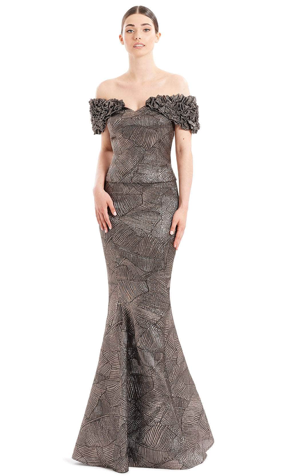 Classy and elegant, this evening gown from Alexander By Daymor 1650 is a definite showstopper at any event. Alluringly crafted in a textured metallic bodice, this eye-catching gown features an off-shoulder sweetheart neckline and cap sleeves with a dramatic touch of ruffle design. The mid-open back is enclosed by a center zipper closure. While the full-length skirt sculpts your figure in a mermaid silhouette. This Alexander By Daymor creation is awesome for prom or for any special night event! Models are wearing the Black, Mocha, Moss, Navy, Silver and Wine colors.