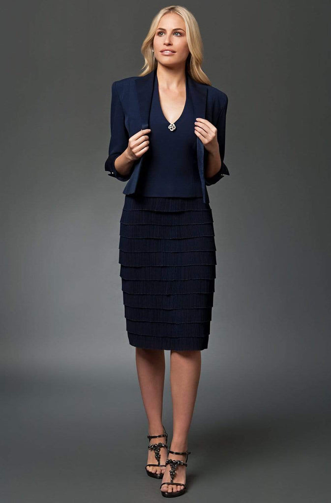 | Details: | Cuffed Jacket, Quarter Sleeves, Tiered Skirt, Two-Piece, Knee Length Hem |
