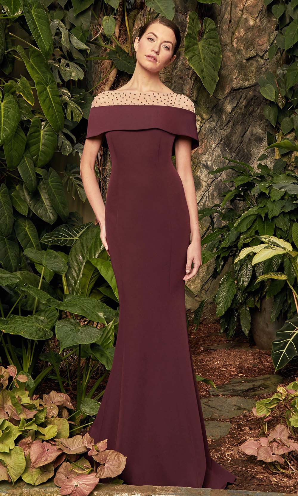 Delicately festooned with beadwork accenting the sheer yoke, this elegant piece flatters with a fold-over accented off-shoulder neckline traversing to an illusion scoop open back. Beautifully fitted along the bodice and the hips, the mermaid skirt flares alluringly down to a sweeping train.