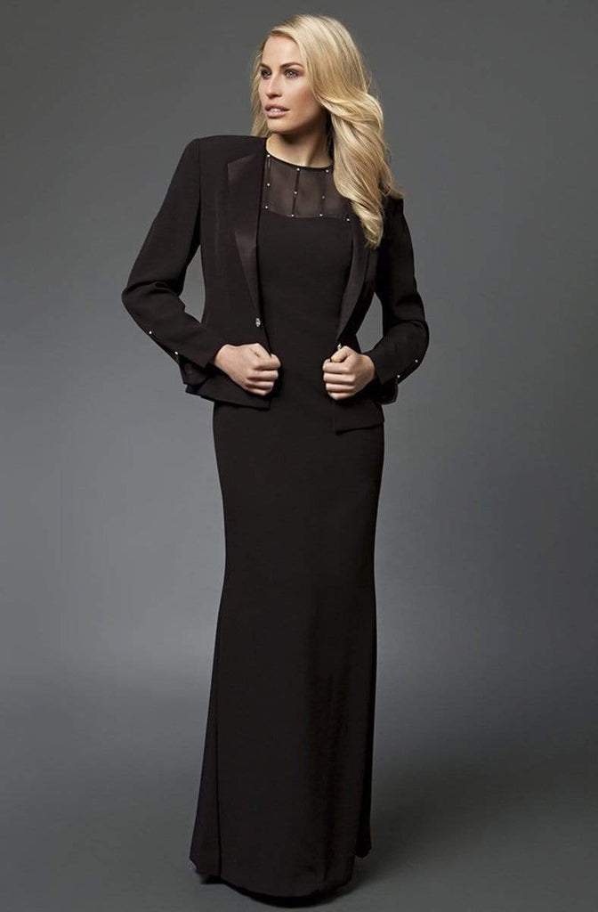 Petite size version to style 2105, this full-length, special occasion dress fashions an illusion jewel neckline with bead accents on the sheer yoke, cap sleeve and sheath skirt. The dress comes with a matching long sleeved peak lapel blazer with one button closure.