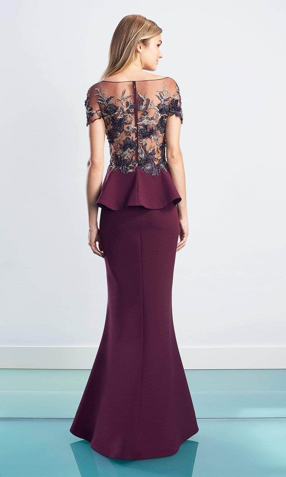 Wear this beautiful peplum gown that parades a trumpet silhouette in full length. It is detailed with embroidery flowers and has a sheer back and illusion neckline. Closes with a back zipper.