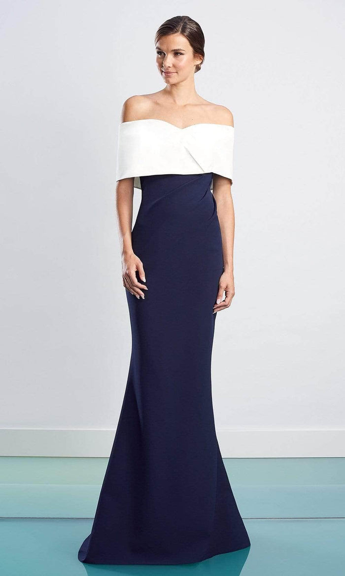 Glam up your wardrobe in a hit creation from Alexander By Daymor 1471. This floor length dress features a semi-sweetheart neckline and an off-shoulder cape sleeves. This dress features a sheath silhouette on a fitted bodice while the back showcases mid-open cut and covered buttons lined at the center flows into a full-length hemline and sweep train. This Alexander By Daymor evening dress is a classic look that works for many special occasions. Model is wearing the Navy/White color.