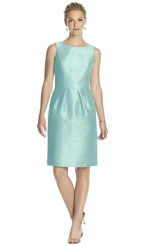 Clean, structured lines play with the cocktail length of this sleeveless dupioni bridesmaid dress. The simple silhouette is enhanced with a natural waist and hidden pockets at the side seams of the skirt's slim pleats.