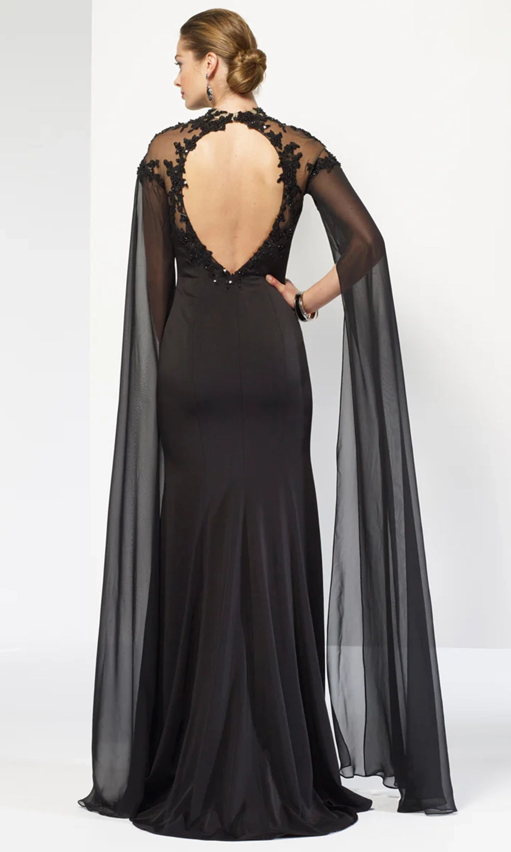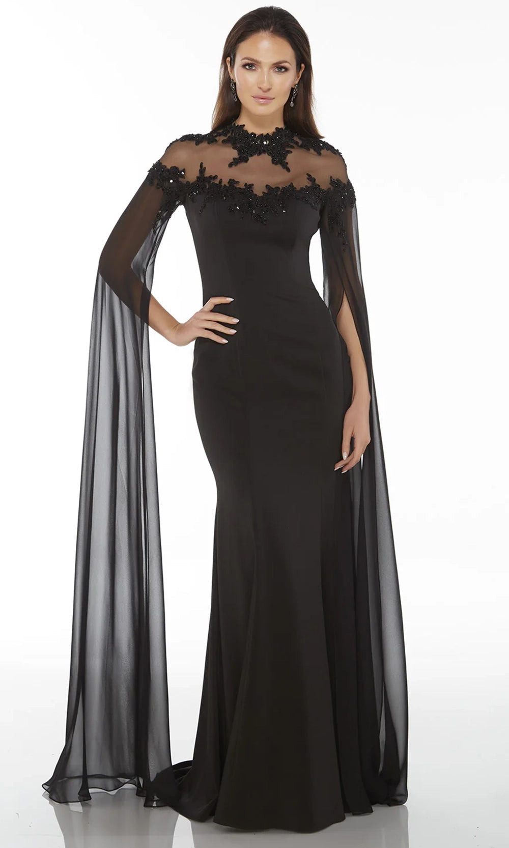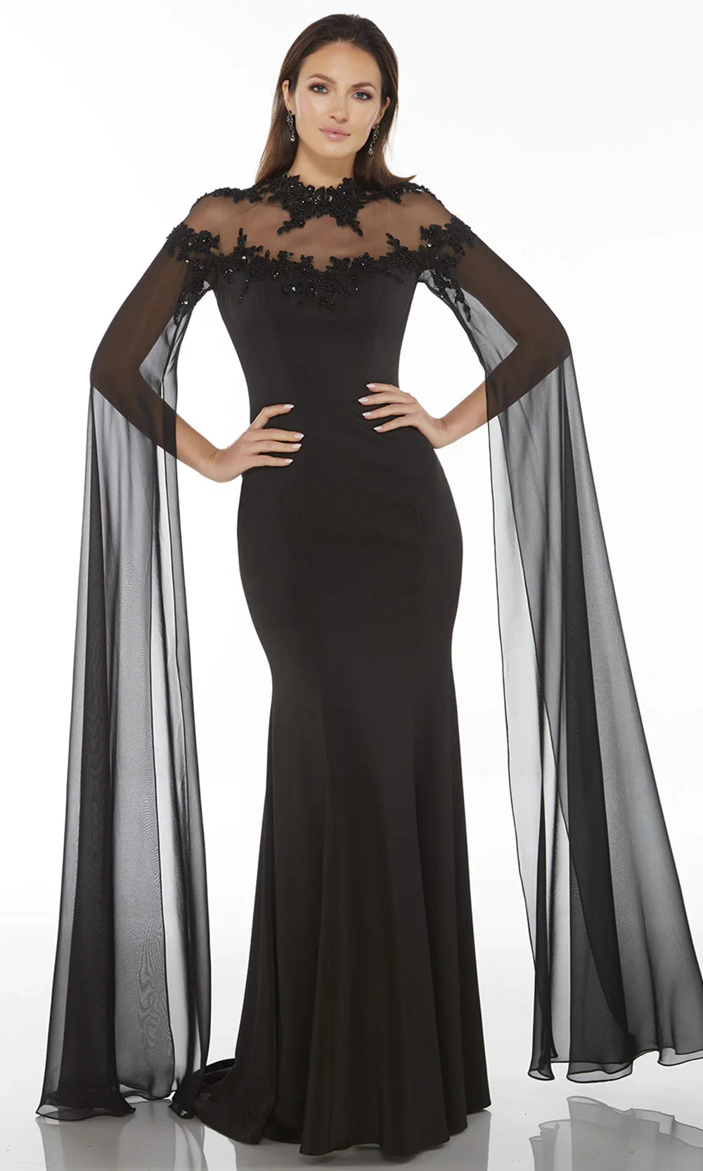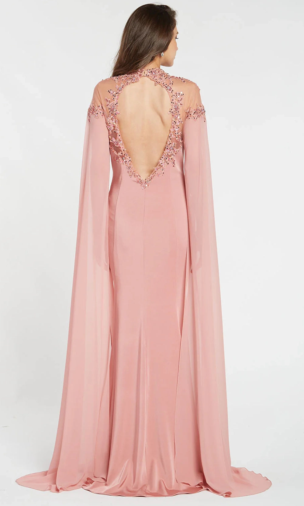 With a presence that commands attention, the Alyce Paris 27173 features elegant chiffon cape sleeves and a structured high neckline for a bold, regal look. The bodice is adorned with detailed beads and embroidery, while the delicate illusion mesh gives the neckline a refined, modern twist. Flowing cape panels and cutout back add drama. The full-length sheath skirt keeps the silhouette clean and timeless. Alyce Paris 27173 is an exquisite choice for anyone seeking an elevated, fashion-forward gown that brings movement, structure, and rich detail together in perfect harmony. Models are wearing Dusty Rose, and Black colors.