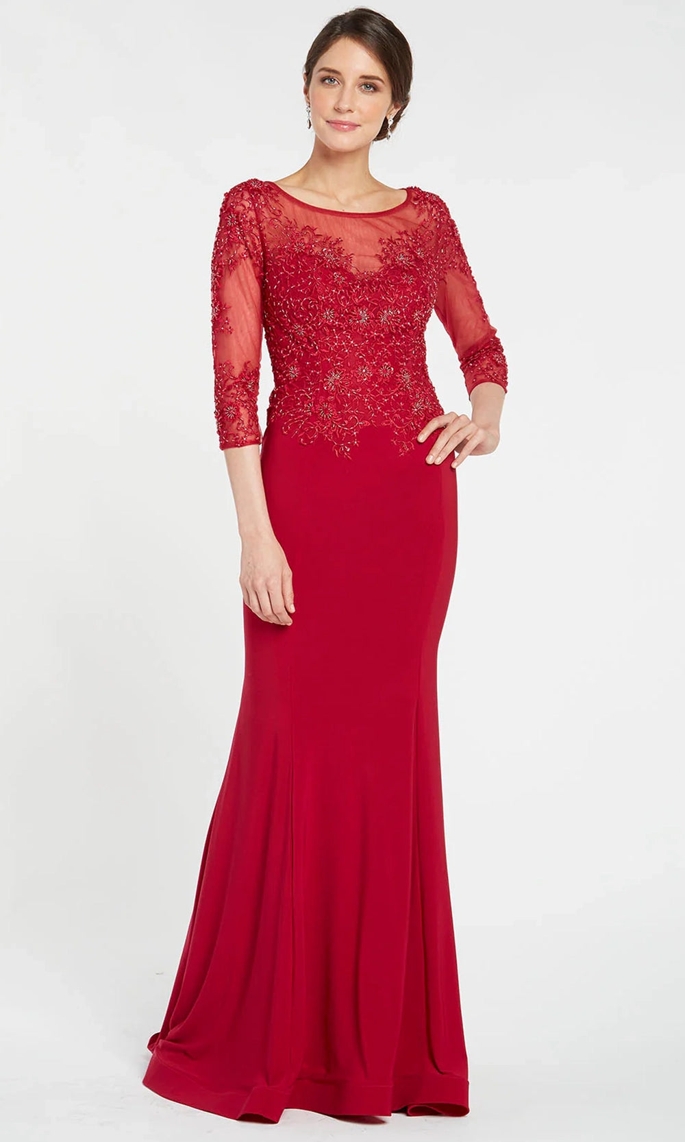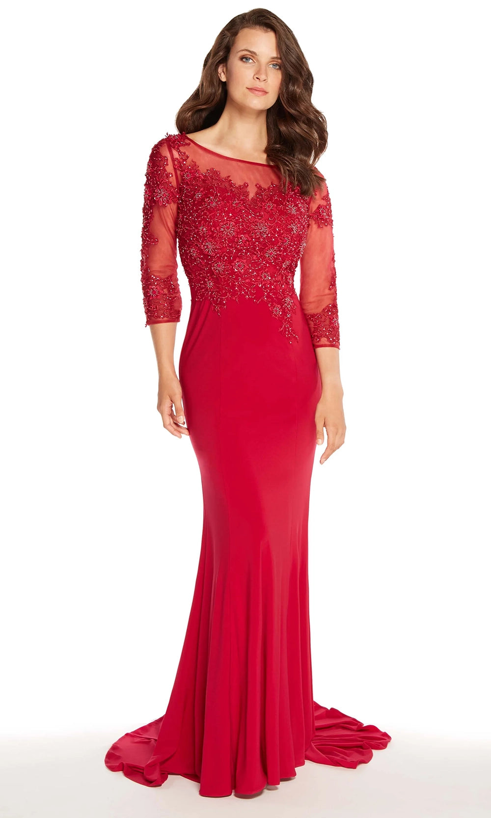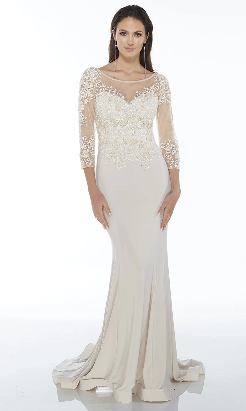 Timeless elegance defines this Alyce Paris 27257 long evening gown, which pairs a richly embroidered beaded bodice with a sleek jersey skirt that flows gracefully to the floor. The illusion bateau neckline, partial illusion back and sheer three-quarter sleeves strike a perfect balance between modesty and style, while the fitted sheath silhouette enhances the figure. Finished with a sweep train, this gown offers drama without excess. Alyce Paris 27257 is ideal for weddings, formal evenings, or events where refined detail and classic glamour are key. Models are wearing Champagne, and Garnet colors.