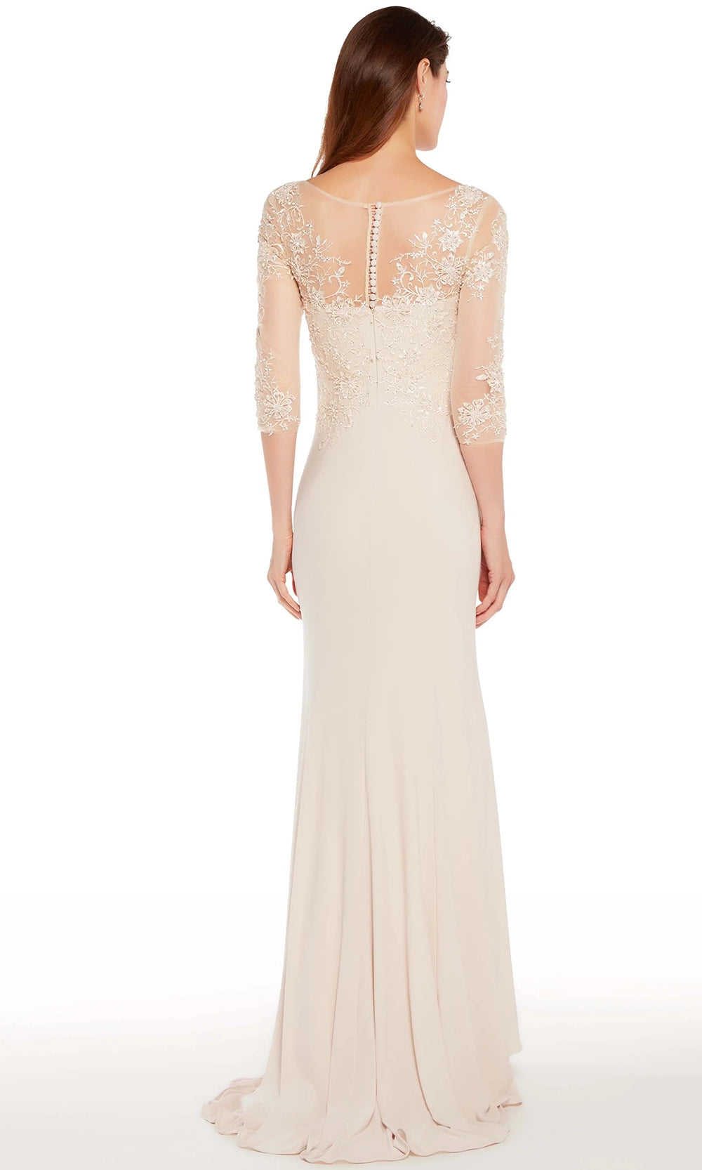 | Details: | Beaded, Lace Bodice, Three-Quarter Sleeves, Sweep Train, Illusion Back With Button Closure |