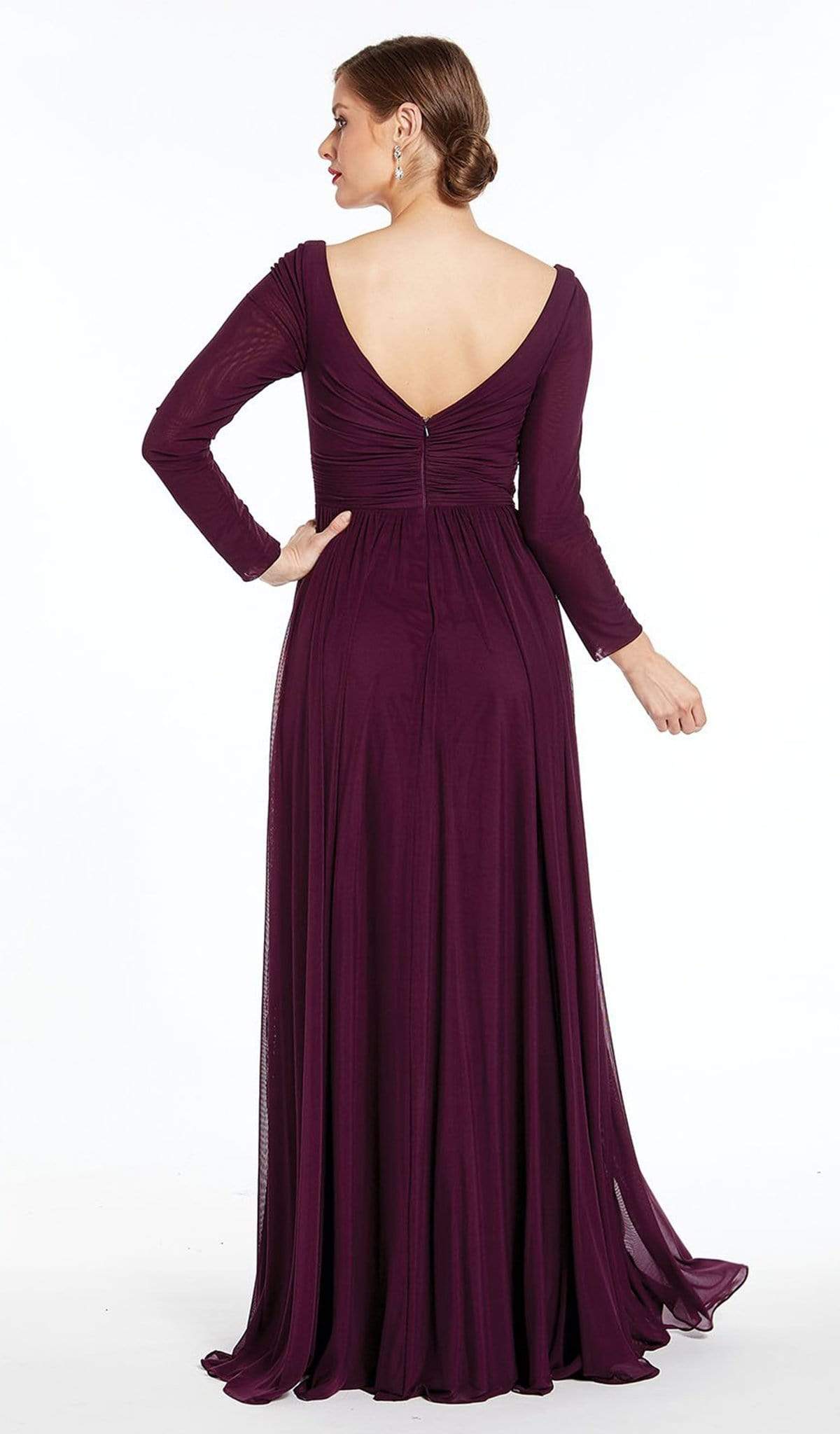 Features a low V neckline with mesh inset support at the center and a V-shaped back. Ruching details at the bust and waist add subtle texture to the bodice. The flowy skirt features a front slit and concludes with a gently sweep train. Model is wearing Eggplant color.