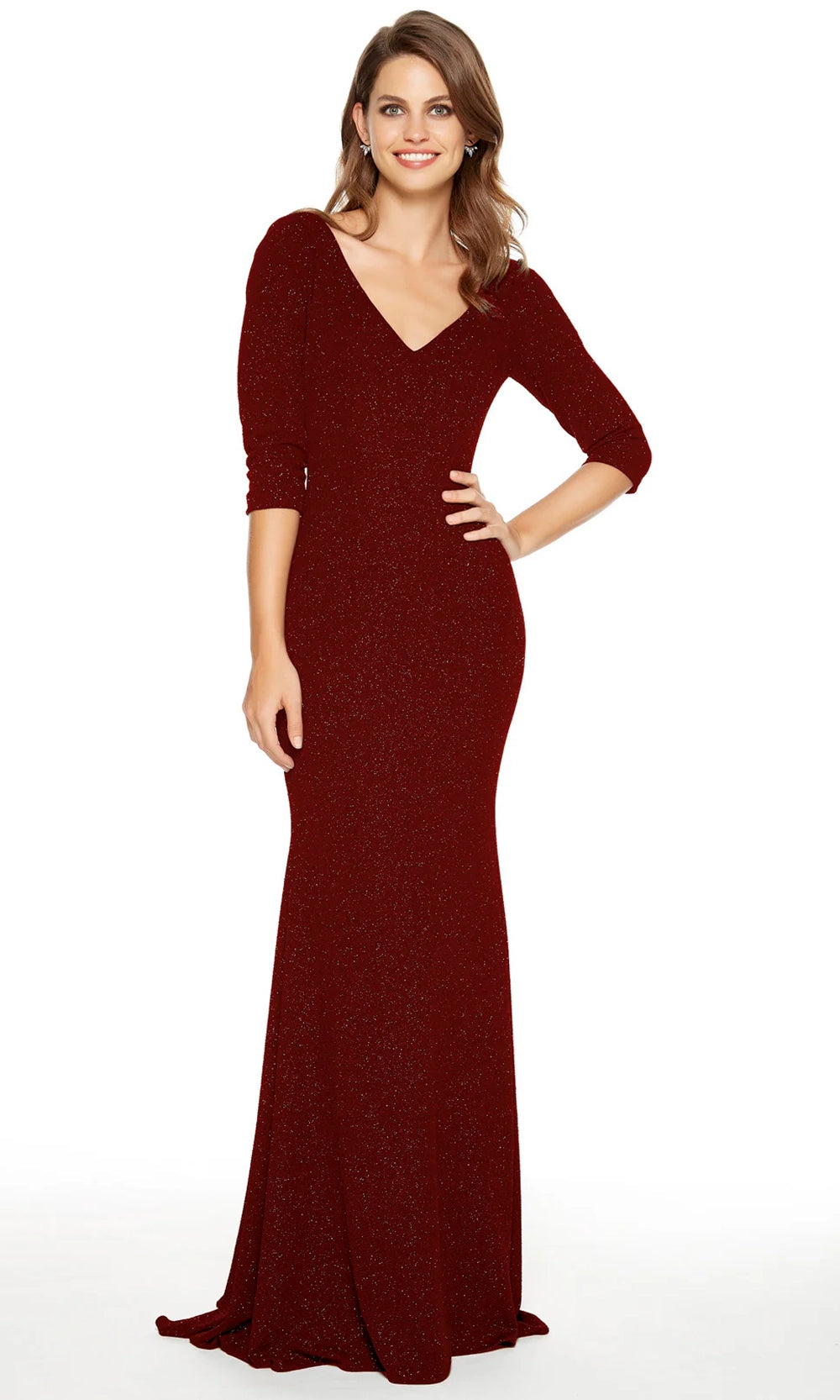 Designed for sleek sophistication, this Alyce Paris 27377 full-length textured jersey gown hugs the figure while providing stretch and comfort. The modest V-neckline adds femininity without excess, framed by three-quarter sleeves that flatter arms and shoulders. A fitted sheath silhouette enhances the natural curves and subtly flares into a gentle sweep train for a touch of theatrical elegance. The shimmering fabric ensures presence under soft lighting or spotlight moments. Alyce Paris 27377 offers a flawless option for formal gatherings, special banquets, or elegant evenings where understated sparkle leaves a lasting impression. Models are wearing Midnight, Peacock, and Wine colors.